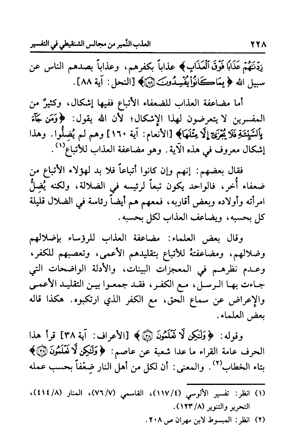 أما مضاعفة العذاب للضعفاء الأتباع ففيها إشكال، وكثير من المفسرين لا يتعرضون لهذا الإشكال؛ لأن الله يقول: {وَمَن جَاء بِالسَّيِّئَةِ فَلاَ يُجْزَى إِلاَّ مِثْلَهَا} [الأنعام: آية 160] وهم لم يُضِلُّوا. وهذا إشكال معروف في هذه الآية. وهو مضاعفة العذاب للأتباع (¬1).
