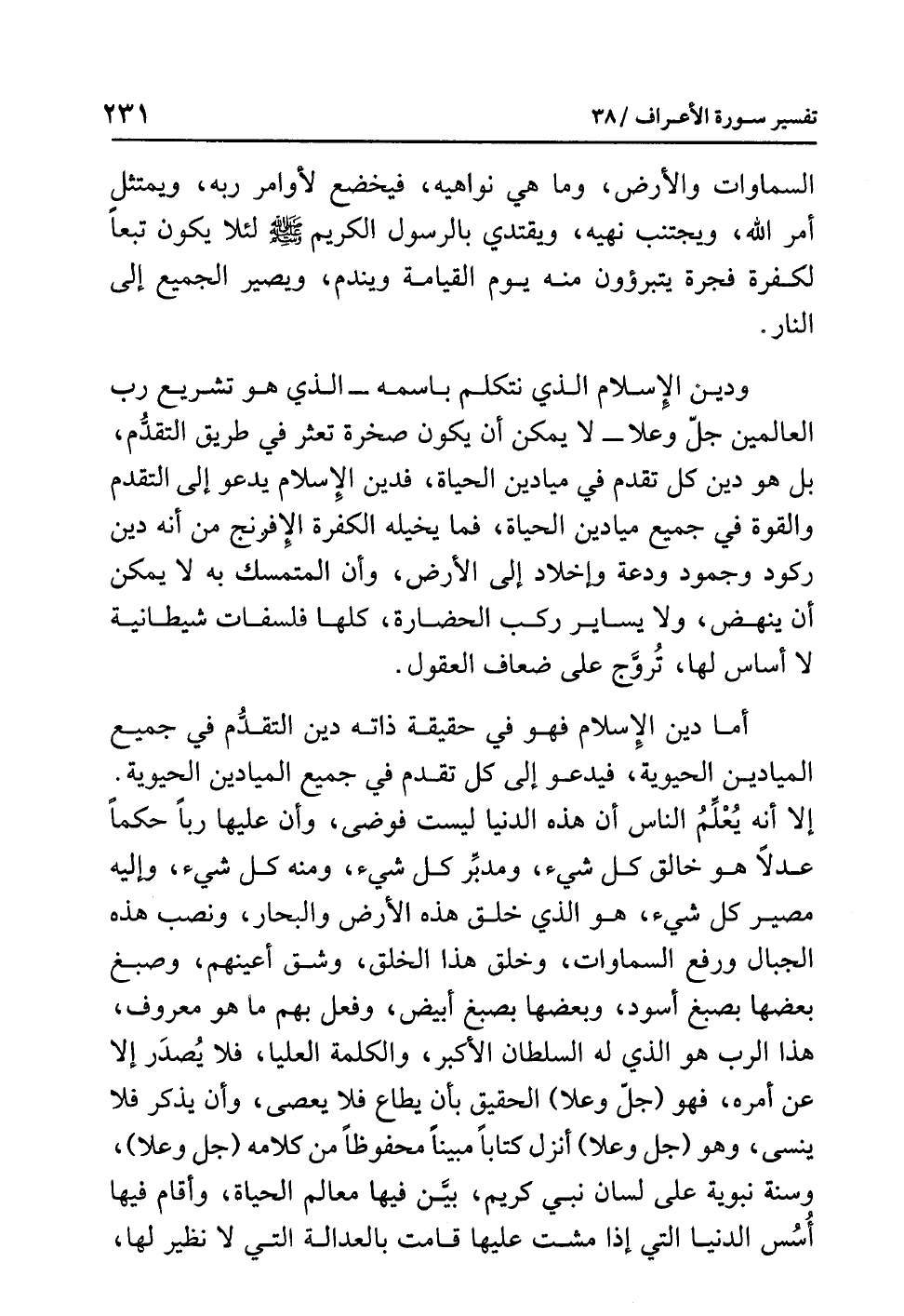 أما دين الإسلام فهو في حقيقة ذاته دين التقدُّم في جميع الميادين الحيوية، فيدعو إلى كل تقدم في جميع الميادين الحيوية، إلا أنه يُعَلِّمُ الناس أن هذه الدنيا ليست فوضى، وأن عليها ربّاً حكماً عدلاً هو خالق كل شيء، ومدبِّر كل شيء، ومنه كل شيء، وإليه مصير كل شيء، هو الذي خلق هذه الأرض والبحار، ونصب هذه الجبال ورفع السماوات، وخلق هذا الخلق، وشق أعينهم، وصبغ بعضها بصبغ أسود، وبعضها بصبغ أبيض، وفعل بهم ما هو معروف، هذا الرب هو الذي له السلطان الأكبر، والكلمة العليا، فلا يُصدَر إلا عن أمره، فهو (جلّ وعلا) الحقيق بأن يطاع فلا يُعْصى، وأن يذكر فلا يُنْسَى، وهو (جل وعلا) أنزل كتاباً مبيناً محفوظاً من كلامه (جل وعلا)، وسنة نبوية على نبي كريم، بيَّن فيها معالم الحياة، وأقام فيها أُسس الدنيا التي إذا مشت عليها قامت بالعدالة التي لا نظير لها،