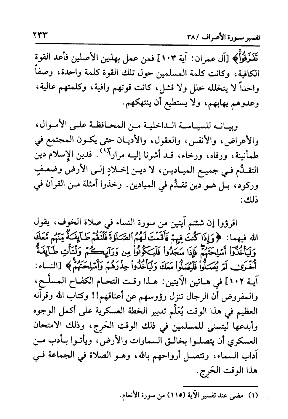 اقرءوا إن شئتم آيتين من سورة النساء في صلاة الخوف، يقول الله فيهما: {وَإِذَا كُنتَ فِيهِمْ فَأَقَمْتَ لَهُمُ الصَّلاَةَ فَلْتَقُمْ طَآئِفَةٌ مِّنْهُم مَّعَكَ وَلْيَأْخُذُواْ أَسْلِحَتَهُمْ فَإِذَا سَجَدُواْ فَلْيَكُونُواْ مِن وَرَآئِكُمْ وَلْتَأْتِ طَآئِفَةٌ أُخْرَى لَمْ يُصَلُّواْ فَلْيُصَلُّواْ مَعَكَ وَلْيَأْخُذُواْ حِذْرَهُمْ وَأَسْلِحَتَهُمْ} [النساء: آية 102] وفي هاتين الآيتين: هذا وقت التحام الكفاح المسلَّح، والمفروض أن الرجال تنزل رؤوسهم عن أعناقهم!! وكتاب الله وقرآنه العظيم في هذا الوقت يُعلِّم تدبير الخطة العسكرية على أكمل الوجوه وأبدعها ليتسنى للمسلمين في ذلك الوقت الحَرِج، وذلك الامتحان العسكري أن يتصلوا بخالق السماوات والأرض، ويأتوا بأدب من آداب السماء، وتتصل أرواحهم بالله، وهو الصلاة في الجماعة في هذا الوقت الحَرِج.