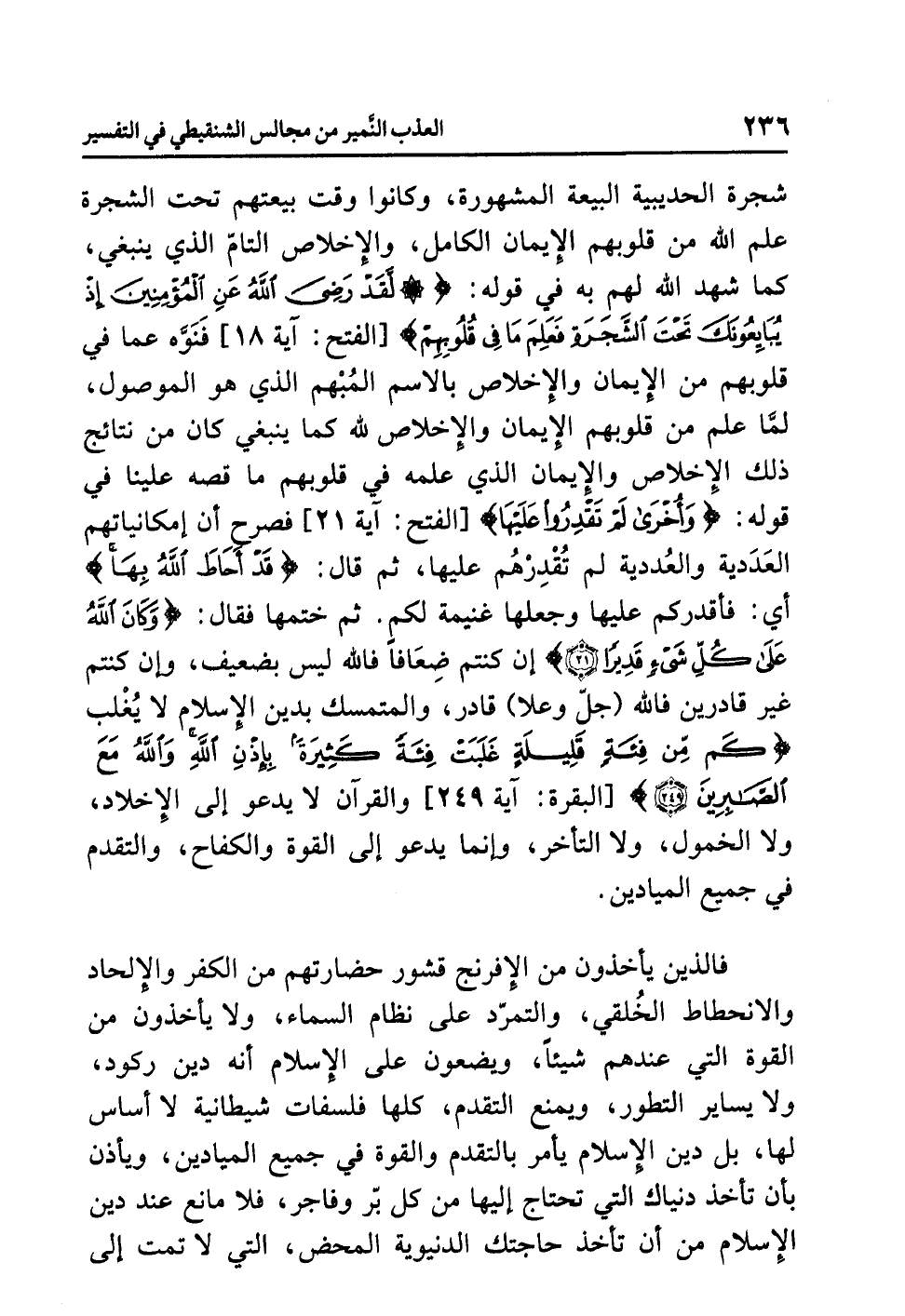 شجرة الحديبية البيعة المشهورة، وكانوا وقت بيعتهم تحت الشجرة علم الله من قلوبهم الإيمان الكامل، والإخلاص التامّ الذي ينبغي، كما شهد الله لهم به في قوله: {لَقَدْ رَضِيَ الله عَنِ الْمُؤْمِنِينَ إِذْ يُبَايِعُونَكَ تَحْتَ الشَّجَرَةِ فَعَلِمَ مَا فِي قُلُوبِهِمْ} [الفتح: آية 18] فَنَوَّه عما في قلوبهم من الإيمان والإخلاص بالاسم المُبْهم الذي هو الموصول، لمَّا علم من قلوبهم الإيمان والإخلاص لله كما ينبغي كان من نتائج ذلك الإخلاص والإيمان الذي علمه في قلوبهم ما قصه علينا في قوله: {وَأُخْرَى لَمْ تَقْدِرُوا عَلَيْهَا} [الفتح: آية 21] فصرح أن إمكانياتهم العَدَدية والعُددية لم تُقْدِرْهُم عليها، ثم قال: {قَدْ أَحَاطَ اللهُ بِهَا} أي: فأقدركم عليها وجعلها غنيمة لكم. ثم ختمها فقال: {وَكَانَ اللهُ عَلَى كُلِّ شَيْءٍ قَدِيراً} إن كنتم ضِعَافاً فالله ليس بضعيف، وإن كنتم غير قادرين فالله (جلّ وعلا) قادر، والمتمسك بدين الإسلام لا يُغلب {كَم مِّن فِئَةٍ قَلِيلَةٍ غَلَبَتْ فِئَةً كَثِيرَةً بِإِذْنِ الله وَالله مَعَ الصَّابِرِينَ} [البقرة: آية 249] والقرآن لا يدعو إلى الإخلاد، ولا الخمول، ولا التأخر، وإنما يدعو إلى القوة والكفاح، والتقدم في جميع الميادين.