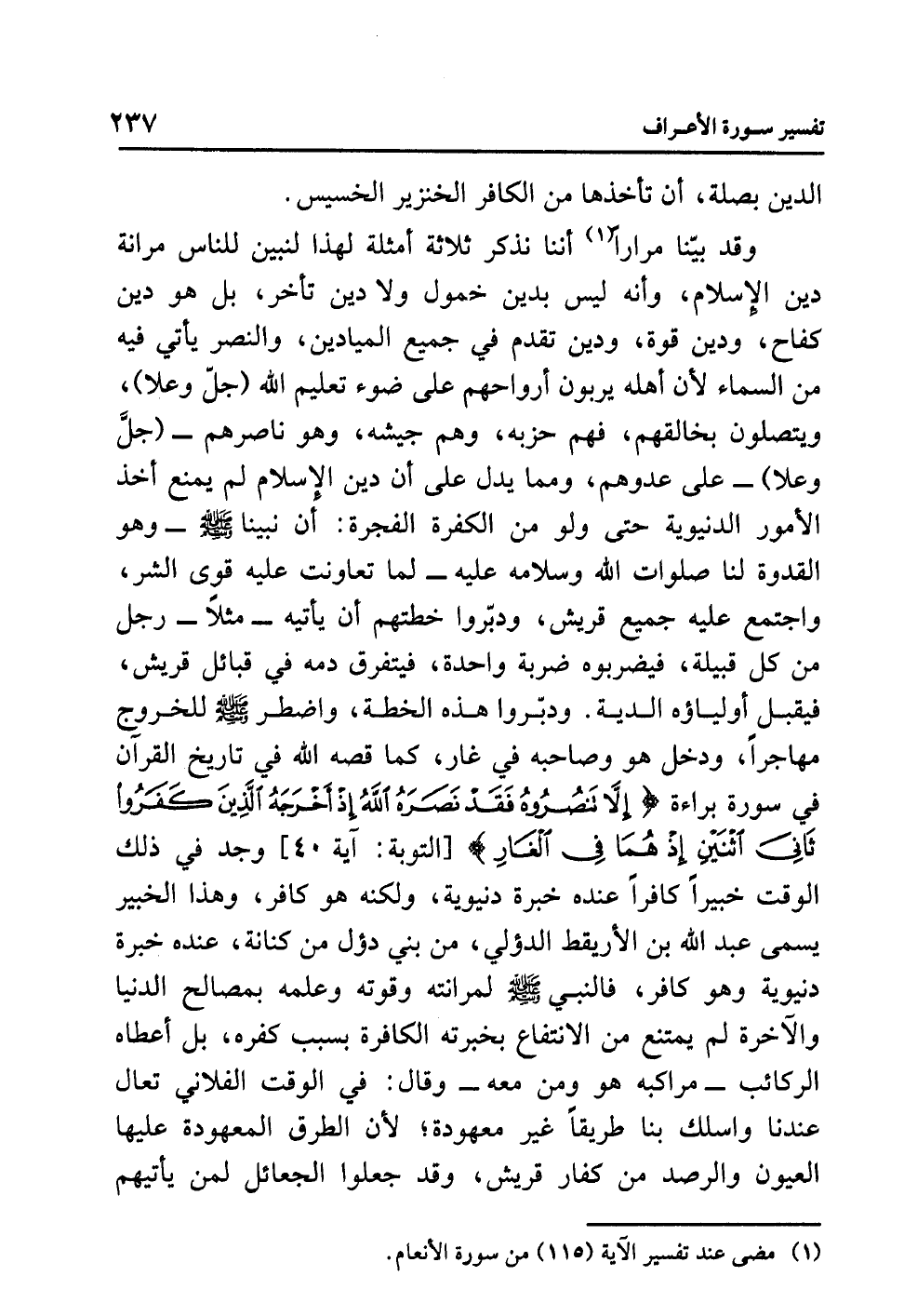 وقد بيّنا مراراً (¬1) أننا نذكر ثلاثة أمثلة لهذا لنبين للناس مرانة دين الإسلام، وأنه ليس بدين خمول ولا دين تأخر، بل هو دين كفاح، ودين قوة، ودين تقدم في جميع الميادين، والنصر يأتي فيه من السماء لأن أهله يربون أرواحهم على ضوء تعليم الله (جلّ وعلا)، ويتصلون بخالقهم، فهم حزبه، وهم جيشه، وهو ناصرهم (جلَّ وعلا) على عدوهم، ومما يدل على أن دين الإسلام لم يمنع أخذ الأمور الدنيوية حتى ولو من الكفرة الفجرة: أن نبينا صلى الله عليه وسلم -وهو القدوة لنا صلوات الله وسلامه عليه- لما تعاونت عليه قوى الشر، واجتمع عليه جميع قريش، ودبّروا خطتهم أن يأتيه -مثلاً- رجل من كل قبيلة، فيضربوه ضربة واحدة، فيتفرق دمه في قبائل قريش، فيقبل أولياؤه الدية. ودبّروا هذه الخطة، واضطر صلى الله عليه وسلم للخروج مهاجراً، ودخل هو وصاحبه في غار، كما قصه الله في تاريخ القرآن في سورة براءة {إِلاَّ تَنصُرُوهُ فَقَدْ نَصَرَهُ الله إِذْ أَخْرَجَهُ الَّذِينَ كَفَرُواْ ثَانِيَ اثْنَيْنِ إِذْ هُمَا فِي الْغَارِ} [التوبة: آية 40] وجد في ذلك الوقت خبيراً كافراً عنده خبرة دنيوية، ولكنه هو كافر، وهذا الخبير يسمى عبد الله بن الأريقط الدؤلي، من بني دؤل من كنانة، عنده خبرة دنيوية وهو كافر، فالنبي صلى الله عليه وسلم لمرانته وقوته وعلمه بمصالح الدنيا والآخرة لم يمتنع من الانتفاع بخبرته الكافرة بسبب كفره، بل أعطاه الركائب -مراكبه هو ومن معه- وقال: في الوقت الفلاني تعال عندنا واسلك بنا طريقاً غير معهودة؛ لأن الطرق المعهودة عليها العيون والرصد من كفار قريش، وقد جعلوا الجعائل لمن يأتيهم