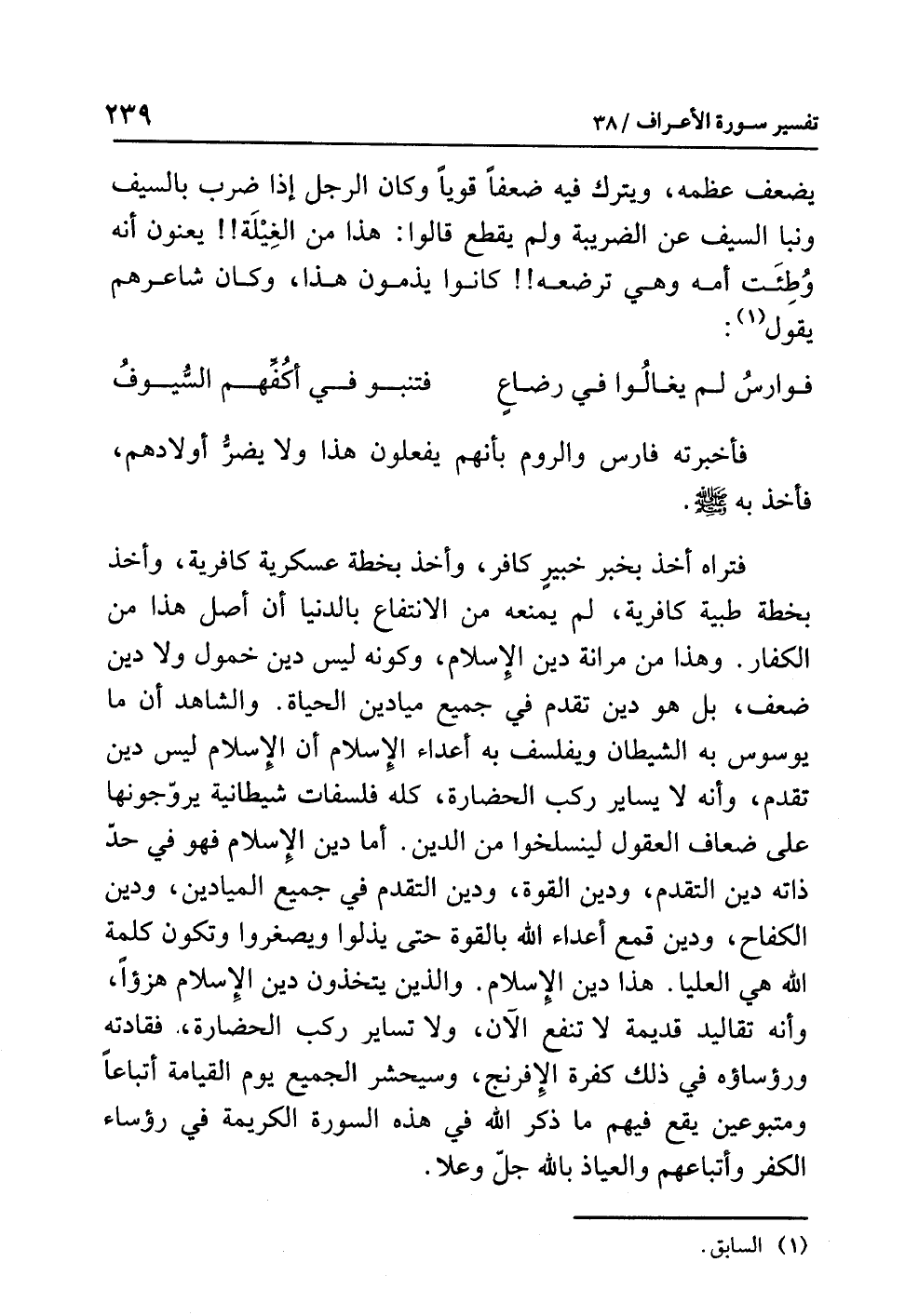 فتراه أخذ بخبر خبيرٍ كافر، وأخذ بخطة عسكرية كافرية، وأخذ بخطة طبية كافرية، لم يمنعه من الانتفاع بالدنيا أن أصل هذا من الكفار، وهذا من مرانة دين الإسلام، وكونه ليس دين خمول ولا دين ضعف، بل هو دين تقدم في جميع ميادين الحياة. والشاهد أن ما يوسوس به الشيطان ويفلسف به أعداء الإسلام أن الإسلام ليس دين تقدم، وأنه لا يساير ركب الحضارة، كله فلسفات شيطانية يروّجونها على ضعاف العقول لينسلخوا من الدين. أما دين الإسلام فهو في حدّ ذاته دين التقدم، ودين القوة، ودين التقدم في جميع الميادين، ودين الكفاح، ودين قمع أعداء الله بالقوة حتى يذلوا ويصغروا وتكون كلمة الله هي العليا. هذا دين الإسلام. والذين يتخذون دين الإسلام هزؤاً، وأنه تقاليد قديمة لا تنفع الآن، ولا تساير ركب الحضارة، فقادته ورؤساؤه في ذلك كفرة الإفرنج، وسيحشر الجميع يوم القيامة أتباعاً ومتبوعين يقع فيهم ما ذكر الله في هذه السورة الكريمة في رؤساء الكفر وأتباعهم والعياذ بالله جلّ وعلا.