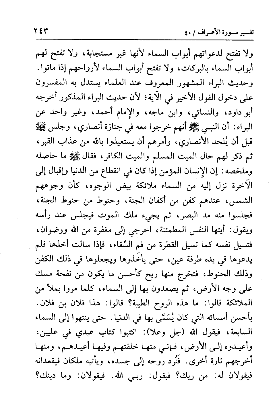 وحديث البراء المشهور المعروف عند العلماء يستدل به المفسرون على دخول القول الأخير في الآية؛ لأن حديث البراء المذكور أخرجه أبو داود، والنسائي، وابن ماجه، والإمام أحمد، وغير واحد عن البراء: أن النبي صلى الله عليه وسلم أنهم خرجوا معه في جنازة أنصاري، وجلس صلى الله عليه وسلم قبل أن يُلحد الأنصاري، وأمرهم أن يستعيذوا بالله من عذاب القبر، ثم ذكر لهم حال الميت المسلم والميت الكافر، فقال صلى الله عليه وسلم ما حاصله وملخَّصه: إن الإنسان المؤمن إذا كان في انقطاع من الدنيا وإقبال إلى الآخرة نزل إليه من السماء ملائكة بيض الوجوه، كأن وجوههم الشمس، عندهم كفن من أكفان الجنة، وحنوط من حنوط الجنة، فجلسوا منه مد البصر، ثم يجيء ملك الموت فيجلس عند رأسه ويقول: أيتها النفس المطمئنة، اخرجي إلى مغفرة من الله ورضوان، فتسيل نفسه كما تسيل القطرة من فمِ السِّقاء، فإذا سالت أخذها فلم يدعوها في يده طرفة عين، حتى يأخذوها ويجعلوها في ذلك الكفن وذلك الحنوط، فتخرج منها ريح كأحسن ما يكون من نفحة مسك على وجه الأرض، ثم يصعدون بها إلى السماء، كلما مروا بملأ من الملائكة قالوا: ما هذه الروح الطيبة؟ قالوا: هذا فلان بن فلان، بأحسن أسمائه التي كان يُسَمَّى بها في الدنيا. حتى ينتهوا إلى السماء السابعة، فيقول الله (جل وعلا): اكتبوا كتاب عبدي في عليين، وأعيدوه إلى الأرض، فإني منها خلقتهم وفيها أعيدهم، ومنها أخرجهم تارة أخرى. فَترد روحه إلى جسده، ويأتيه ملكان فيقعدانه فيقولان له: مَنْ رَبُّكَ؟ فيقول: ربي الله. فيقولان: وما دينك؟