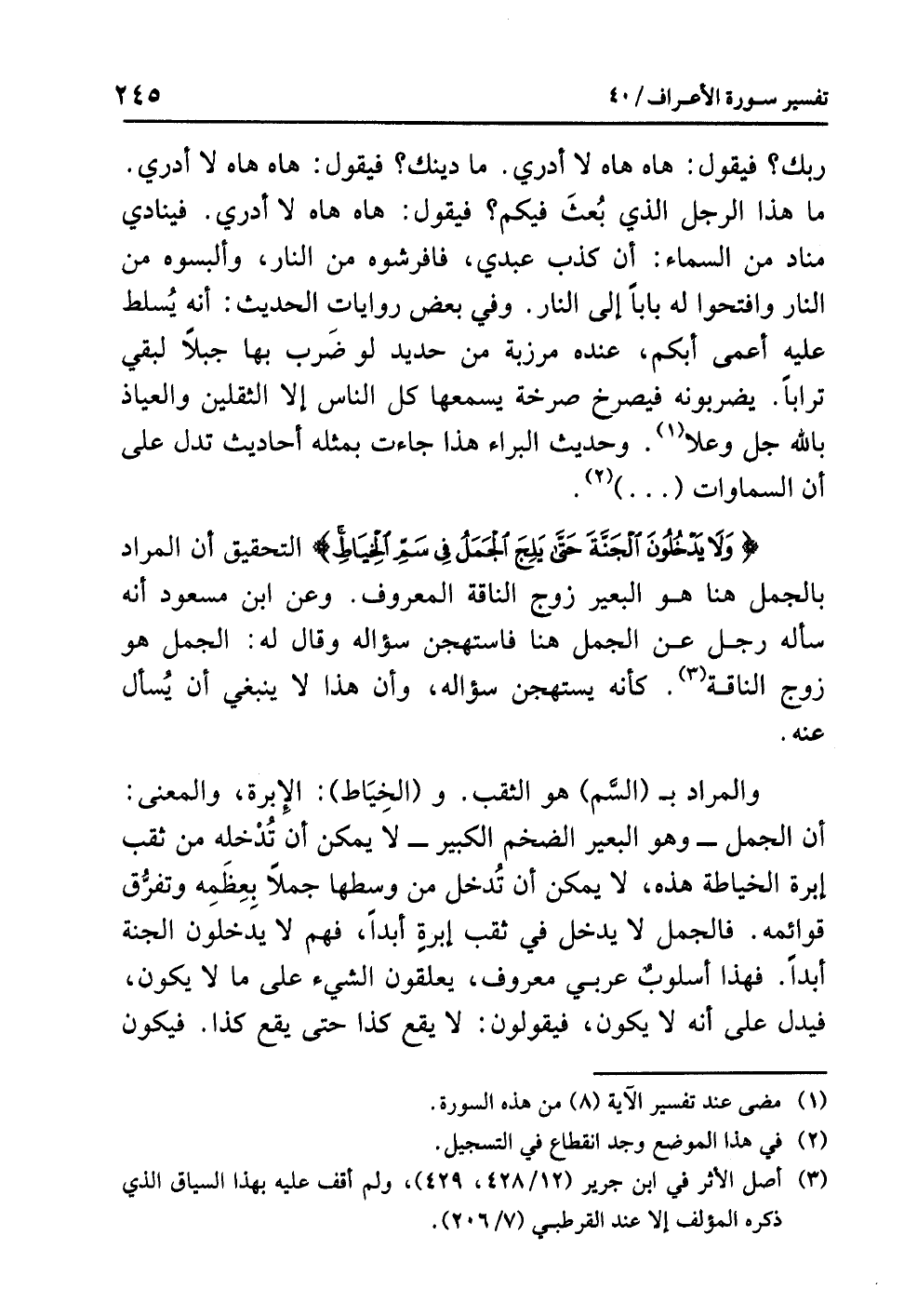 {وَلاَ يَدْخُلُونَ الْجَنَّةَ حَتَّى يَلِجَ الْجَمَلُ فِي سَمِّ الْخِيَاطِ} التحقيق أن المراد بالجمل هنا هو البعير زوج الناقة المعروف. وعن ابن مسعود أنه سأله رجل عن الجمل هنا فاستهجن سؤاله وقال له: الجمل هو زوج الناقة (¬3). كأنه يستهجن سؤاله، وأن هذا لا ينبغي أن يُسأل عنه.