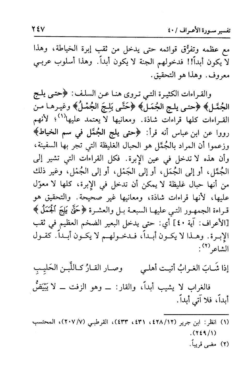 والقراءات الكثيرة التي تروى هنا عن السلف: {حتى يلج الجُمَّل} {حتى يلج الجُمَل} {حَتَّى يَلِجَ الجُمْلُ} وغيرها من القراءات كلها قراءات شاذة. ومعانيها لا يعتمد عليها (¬1)؛ لأنهم رووا عن ابن عباس أنه قرأ: {حَتَّى يَلِجَ الجُمَّل فِي سَمِّ الْخِيَاطِ} وزعموا أن المراد بالجُمَّل هو الحبال الغليظة التي تجر بها السفينة، وأن هذه لا تدخل في عين الإبرة. فكل القراءات التي تشير إلى الجُمَّل، أو إلى الجُمَل، أو إلى الجَمْل، أو إلى الجُمْل، وغير ذلك من أنها حبال غليظة لا يمكن أن تدخل في الإبرة، كلها لا معوّل عليها، لأنها قراءات شاذة، ومعانيها غير صحيحة. والتحقيق هو قراءة الجمهور التي عليها السبعة بل والعشرة {حَتَّى يَلِجَ الْجَمَلُ} [الأعراف: آية 40] أي: حتى يدخل البعير الضخم العظيم في ثقب الإبرة. وهذا لا يكون أبداً، فدخولهم لا يكون أبداً. كقول الشاعر (¬2):