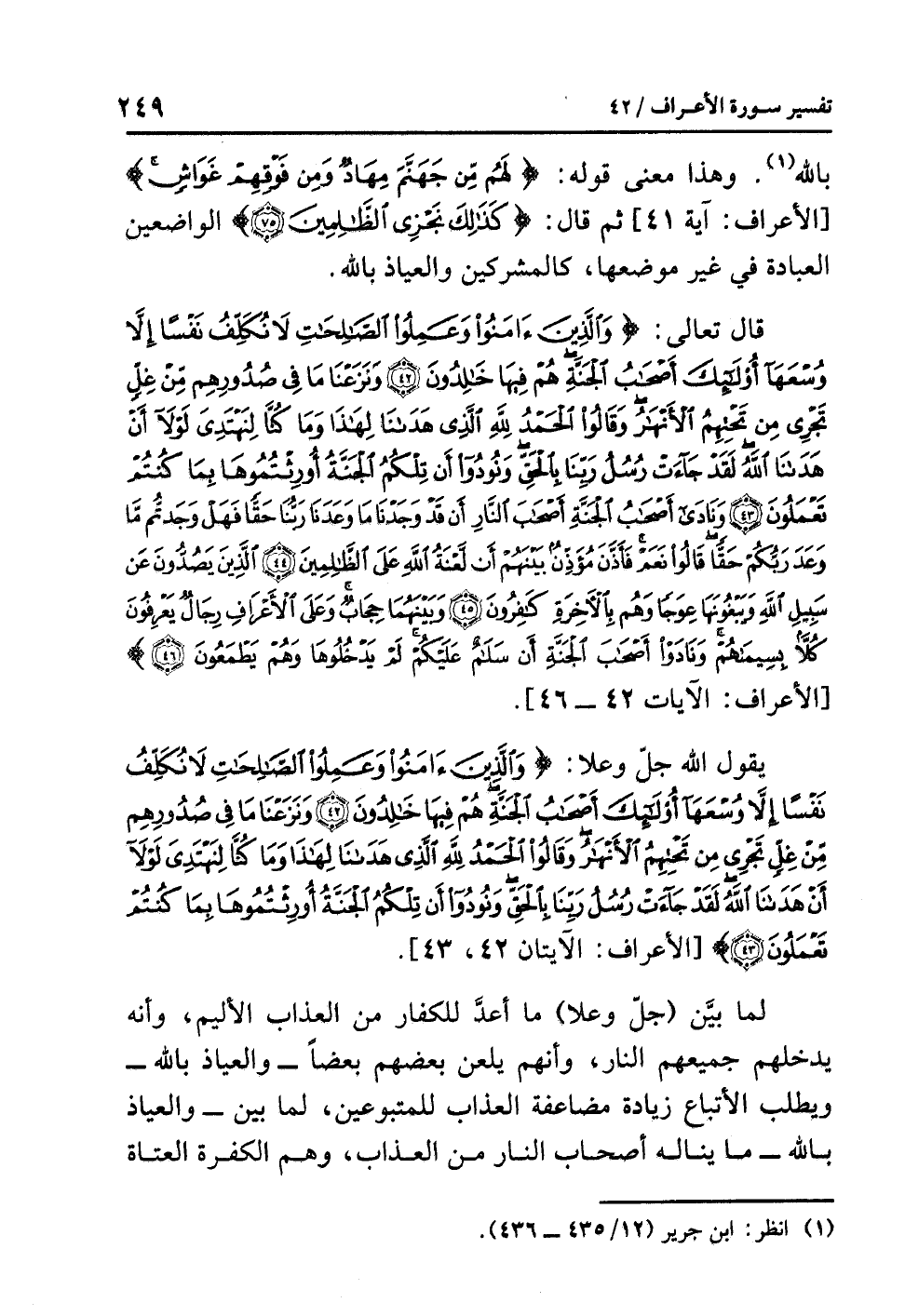 قال تعالى: {وَالَّذِينَ آمَنُواْ وَعَمِلُواْ الصَّالِحَاتِ لاَ نُكَلِّفُ نَفْساً إِلاَّ وُسْعَهَا أُوْلَئِكَ أَصْحَابُ الْجَنَّةِ هُمْ فِيهَا خَالِدُونَ (42) وَنَزَعْنَا مَا فِي صُدُورِهِم مِّنْ غِلٍّ تَجْرِي مِن تَحْتِهِمُ الأَنْهَارُ وَقَالُواْ الْحَمْدُ لِلّهِ الَّذِي هَدَانَا لِهَذَا وَمَا كُنَّا لِنَهْتَدِيَ لَوْلا أَنْ هَدَانَا الله لَقَدْ جَاءتْ رُسُلُ رَبِّنَا بِالْحَقِّ وَنُودُواْ أَن تِلْكُمُ الْجَنَّةُ أُورِثْتُمُوهَا بِمَا كُنتُمْ تَعْمَلُونَ (43) وَنَادَى أَصْحَابُ الْجَنَّةِ أَصْحَابَ النَّارِ أَن قَدْ وَجَدْنَا مَا وَعَدَنَا رَبُّنَا حَقّاً فَهَلْ وَجَدتُّم مَّا وَعَدَ رَبُّكُمْ حَقّاً قَالُواْ نَعَمْ فَأَذَّنَ مُؤَذِّنٌ بَيْنَهُمْ أَن لَّعْنَةُ الله عَلَى الظَّالِمِينَ (44) الَّذِينَ يَصُدُّونَ عَن سَبِيلِ الله وَيَبْغُونَهَا عِوَجاً وَهُم بِالآخِرَةِ كَافِرُونَ (45) وَبَيْنَهُمَا حِجَابٌ وَعَلَى الأَعْرَافِ رِجَالٌ يَعْرِفُونَ كُلاًّ بِسِيمَاهُمْ وَنَادَوْاْ أَصْحَابَ الْجَنَّةِ أَن سَلاَمٌ عَلَيْكُمْ لَمْ يَدْخُلُوهَا وَهُمْ يَطْمَعُونَ (46)} [الأعراف: الآيات 42 - 46].