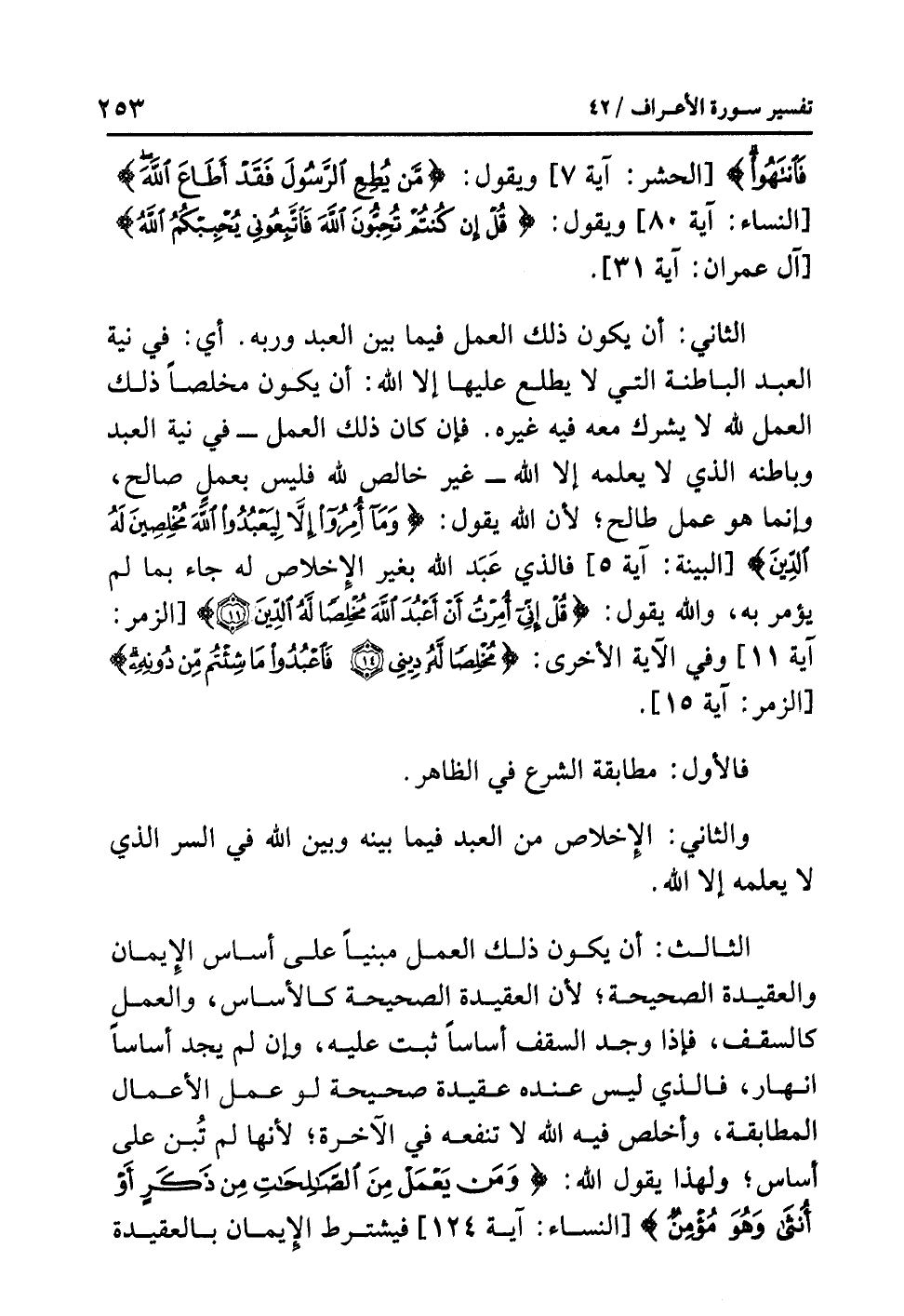 الثاني: أن يكون ذلك العمل فيما بين العَبْدِ وَرَبِّهِ؛ أي: في نية العبد الباطنة التي لا يطلع عليها إلا الله: أن يكون مخلصاً ذلك العمل لله لا يشرك معه فيه غيره. فإن كان ذلك العمل -في نية العبد وباطنه الذي لا يعلمه إلا الله- غير خالص لله فليس بعمل صالح، وإنما هو عمل طالح؛ لأن الله يقول: {وَمَا أُمِرُوا إِلاَّ لِيَعْبُدُوا الله مُخْلِصِينَ لَهُ الدِّينَ} [البينة: آية 5] فالذي عَبَد الله بغير الإخلاص له جاء بما لم يؤمر به، والله يقول: {قُلْ إِنِّي أُمِرْتُ أَنْ أَعْبُدَ الله مُخْلِصاً لَّهُ الدِّينَ (11)} [الزمر: آية 11] وفي الآية الأخرى: {مُخْلِصاً لَّهُ دِينِي فَاعْبُدُوا مَا شِئْتُم مِّن دُونِهِ} [الزمر: آية 15].