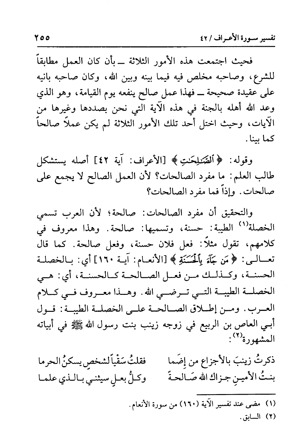 وقوله: {الصَّالِحَات} [الأعراف: آية 42] أصله يستشكل طالب العلم: ما مفرد الصالحات؟ لأن العمل الصالح لا يجمع على صالحات. وإذاً فما مفرد الصالحات؟