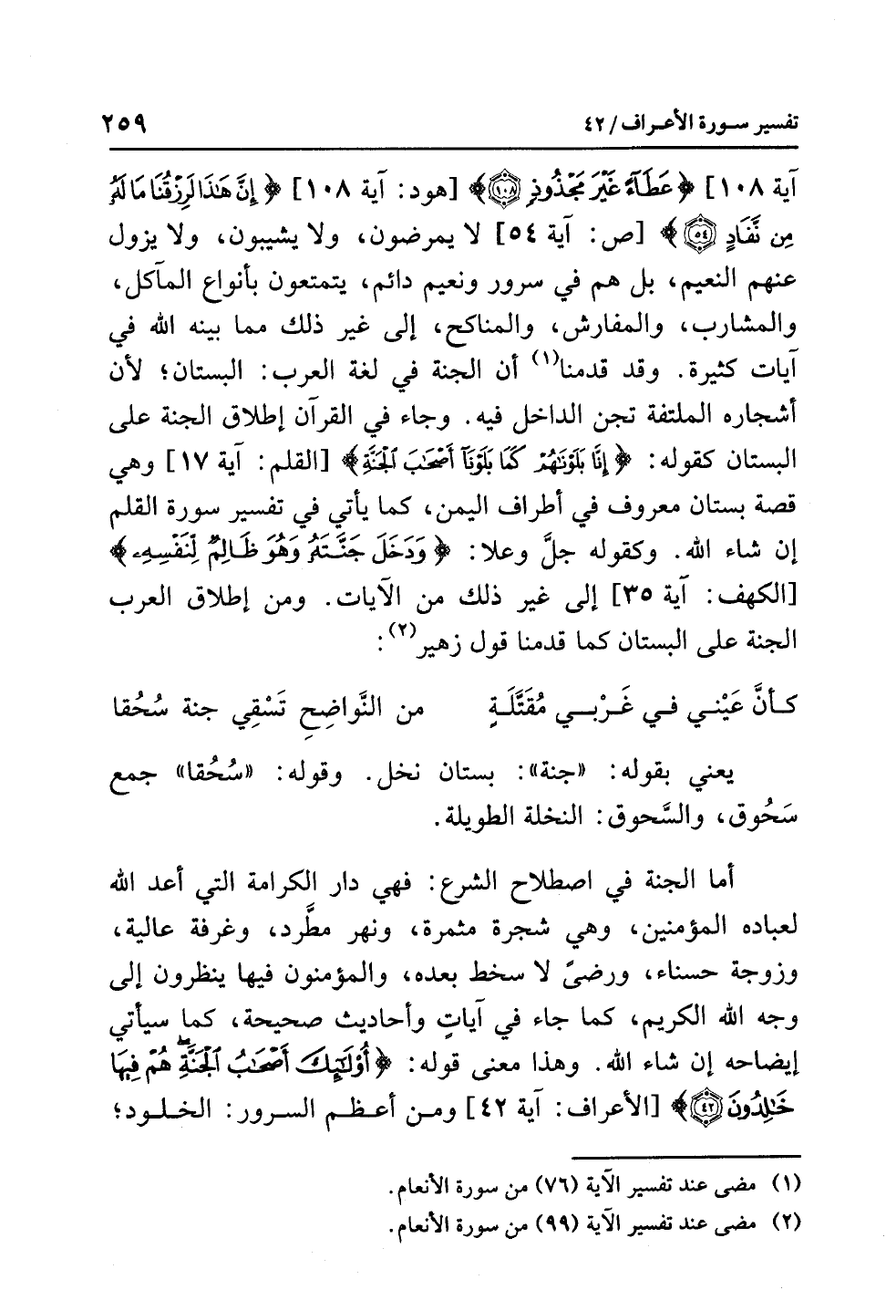 آية 108] {عَطَاء غَيْرَ مَجْذُوذٍ} [هود: آية 108] {إِنَّ هَذَا لَرِزْقُنَا مَا لَهُ مِن نَّفَادٍ (54)} [ص: آية 54] لا يمرضون، ولا يشيبون، ولا يزول عنهم النعيم، بل هم في سرور ونعيم دائم، يتمتعون بأنواع المآكل، والمشارب، والمفارش، والمناكح، إلى غير ذلك ممَّا بَيَّنَهُ الله في آيات كثيرة. وقد قدمنا (¬1) أن الجنة في لغة العرب: البستان؛ لأن أشجاره الملتفة تجن الداخل فيه.