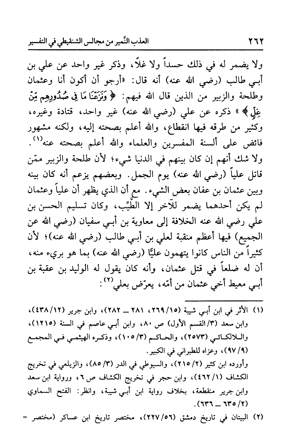 ولا شك أنهم إن كان بينهم في الدنيا شيء؛ لأن طلحة والزبير ممّن قاتل عليّاً (رضي الله عنه) يوم الجمل، وبعضهم يزعم أنه كان بينه وبين عثمان بن عفان بعض الشيء، مع أن الذي يظهر أن عليّاً وعثمان لم يكن أحدهما يضمر للآخر إلا الطَّيِّب، وكان تسليم الحسن بن علي رضي الله عنه الخلافة إلى معاوية بن أبي سفيان (رضي الله عن الجميع) فيها أعظم منقبة لعلي بن أبي طالب (رضي الله عنه)؛ لأن كثيراً من الناس كانوا يتهمون عليّاً (رضي الله عنه) بما هو بريء منه، أن له ضلعاً في قتل عثمان، وأنه كان يقول له الوليد بن عقبة بن أبي معيط أخي عثمان من أمّه، يعرّض بعلي (¬2):