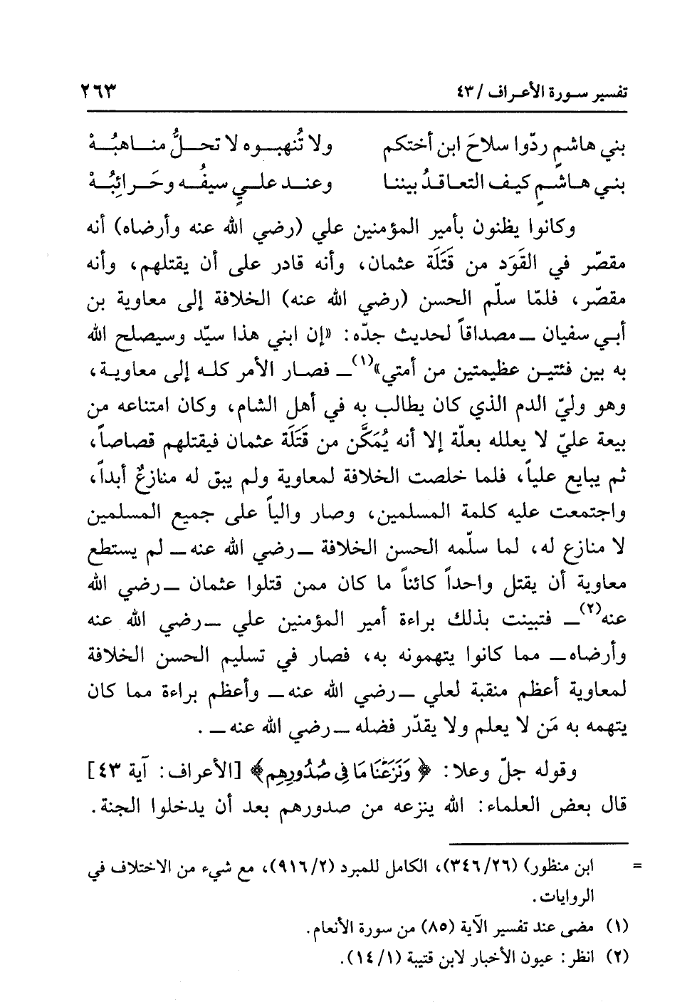 وكانوا يظنون بأمير المؤمنين علي (رضي الله عنه وأرضاه) أنه مقصِّر في القَوَد من قَتَلَة عثمان، وأنه قادر على أن يقتلهم، وأنه مقصّر، فلما سلّم الحسن (رضي الله عنه) الخلافة إلى معاوية بن أبي سفيان -مصداقاً لحديث جدّه: «إِنَّ ابْنِي هَذَا سَيِّدٌ وَسَيُصْلِحُ اللهُ بِهِ بَيْنَ فِئَتَيْنِ عَظِيمَتَيْنِ مِنْ أُمَّتِي» (¬1) - فصار الأمر كله إلى معاوية، وهو وليّ الدم الذي كان يطالب به في أهل الشام، وكان امتناعه من بيعة عليّ لا يعلله بعلّة إلا أنه يُمَكِّن من قَتَلَة عثمان فيقتلهم قصاصاً، ثم يبايع عليّاً، فلما خلصت الخلافة لمعاوية ولم يبق له منازعٌ أبداً، واجتمعت عليه كلمة المسلمين، وصار والياً على جميع المسلمين لا منازع له، لما سلّمه الحسن الخلافة -رضي الله عنه- لم يستطع معاوية أن يقتل واحداً كائناً ما كان ممن قتلوا عثمان -رضي الله عنه (¬2) - فتبينت بذلك براءة أمير المؤمنين علي -رضي الله عنه وأرضاه- مما كانوا يتهمونه به، فصار في تسليم الحسن الخلافة لمعاوية أعظم منقبة لعلي -رضي الله عنه- وأعظم براءة مما كان يُتَّهمُ به مِمَّن لا يعلم ولا يقدّر فضله رضي الله عنه.