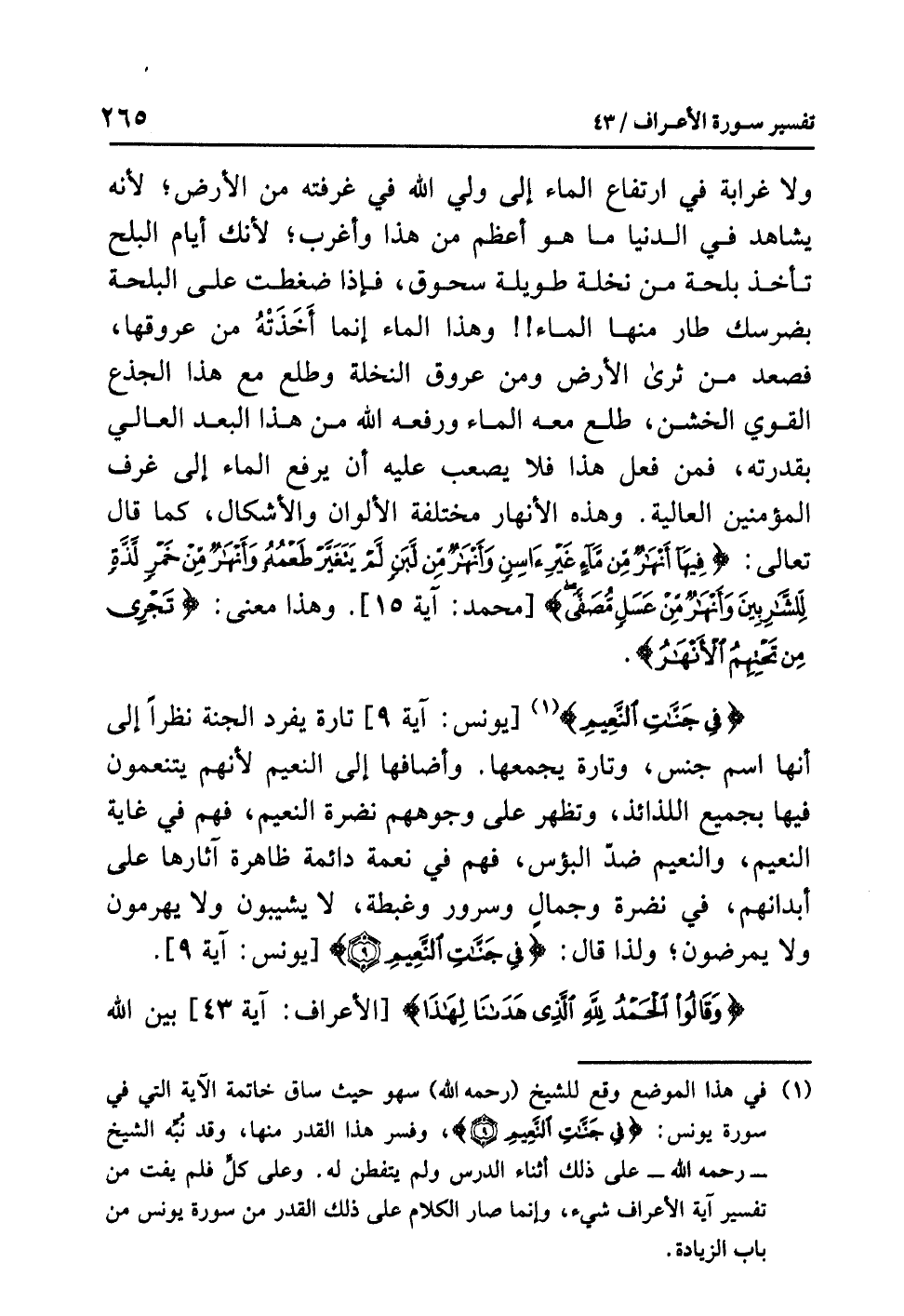 (¬1) في هذا الموضع وقع للشيخ (رحمه الله) سهو حيث ساق خاتمة الآية التي في سورة يونس: {فِي جَنَّاتِ النَّعِيمِ} وفسر هذا القدر منها، وقد نُبِّه الشيخ -رحمه الله- على ذلك أثناء الدرس ولم يتفطن له. وعلى كلٍّ فلم يفت من تفسير آية الأعراف شيء، وإنما صار الكلام على ذلك القدر من سورة يونس من باب الزيادة.