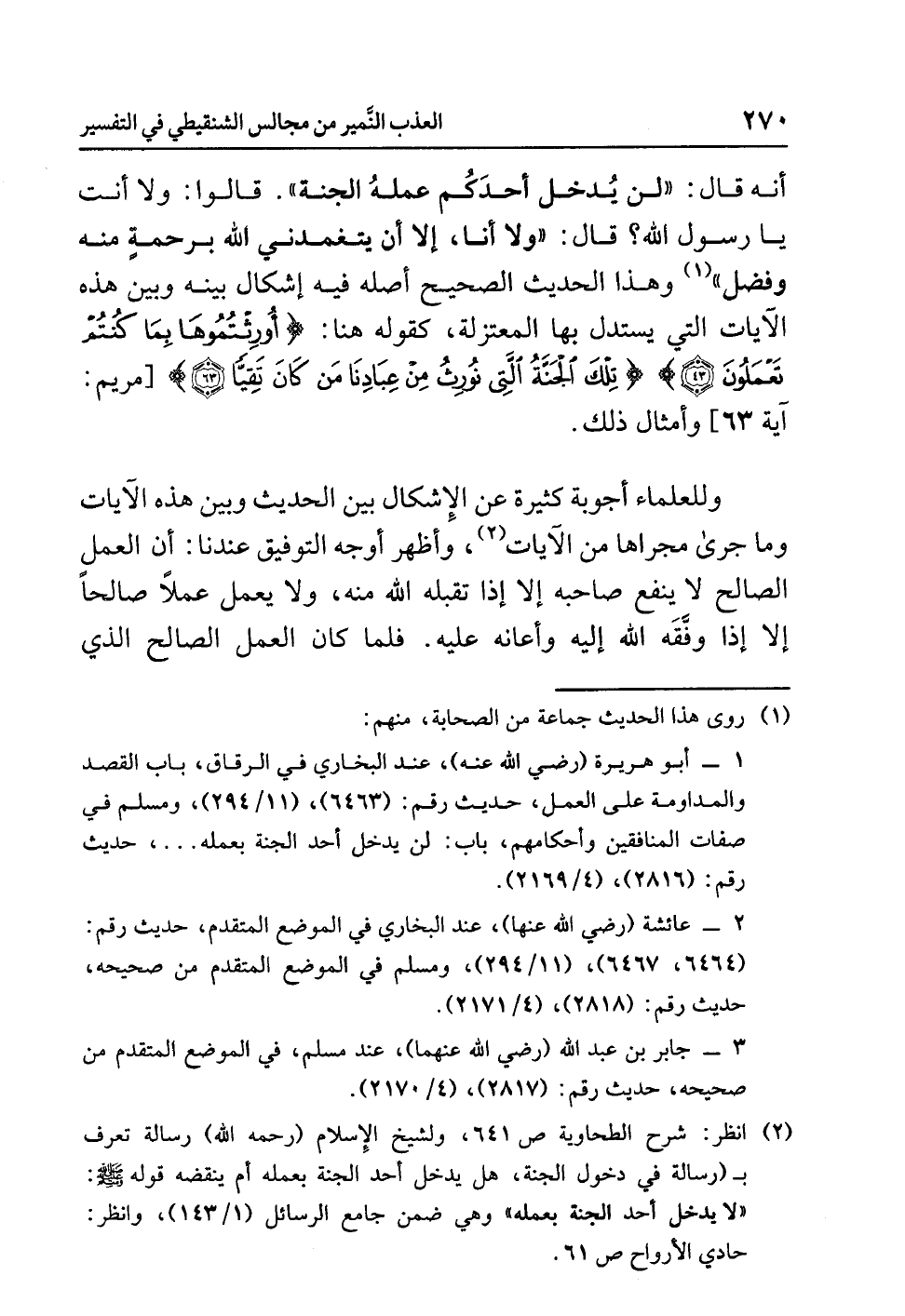 (¬2) انظر: شرح الطحاوية ص641، ولشيخ الإسلام (رحمه الله) رسالة تعرف بـ (رسالة في دخول الجنة، هل يدخل أحد الجنة بعمله أم ينقضه قوله صلى الله عليه وسلم: «لاَ يَدْخُلُ أَحَدٌ الجَنَّةَ بِعَمَلِهِ» وهي ضمن جامع الرسائل (1/ 143)، وانظر حادي الأرواح ص61.