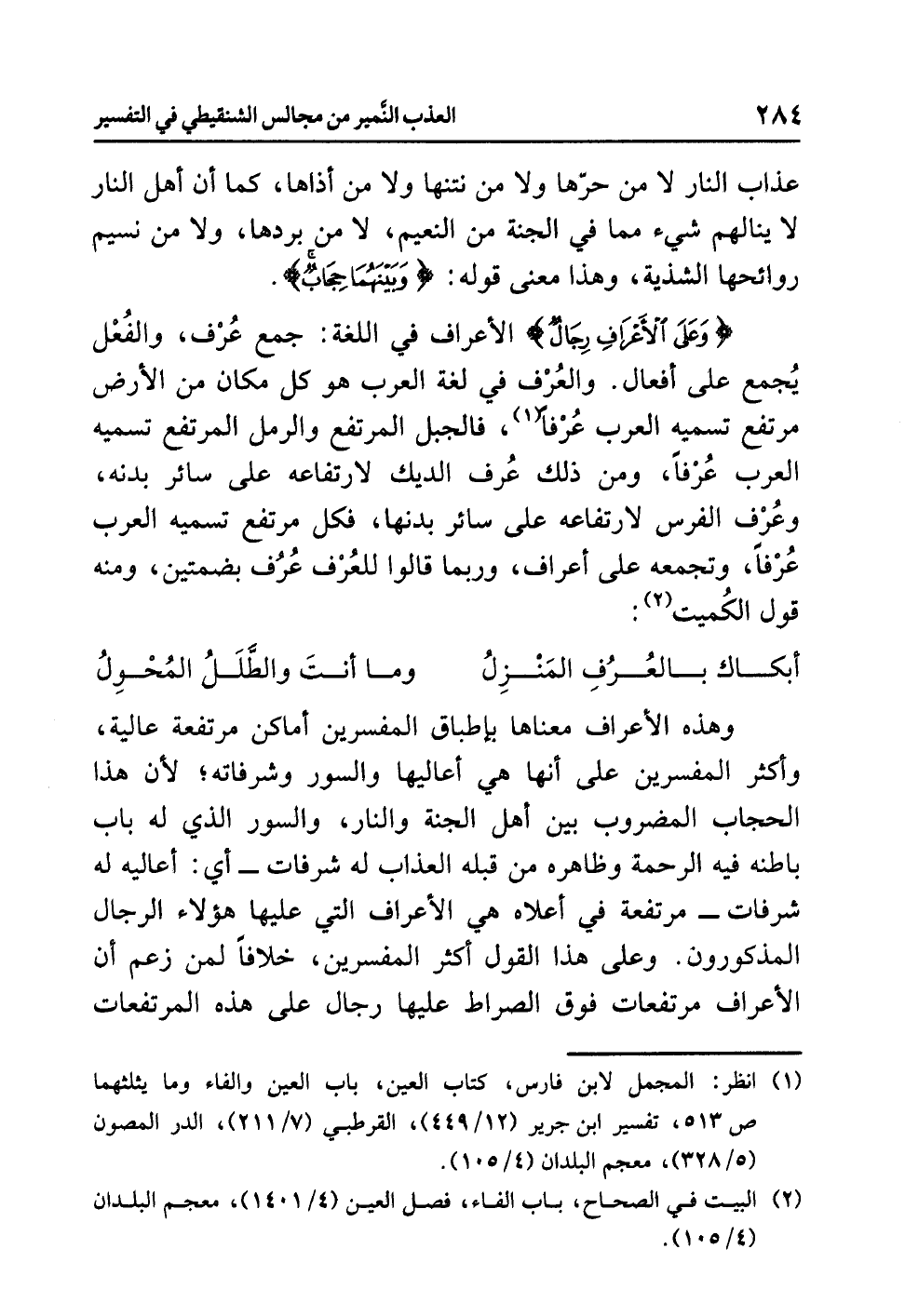 وهذه الأعراف معناها بإطباق المفسرين: أماكن مرتفعة عالية، وأكثر المفسرين على أنها هي أعاليها، والسور وشرفاته؛ لأن هذا الحجاب المضروب بين أهل الجنة والنار، والسور الذي له باب باطنه فيه الرحمة وظاهره من قبله العذاب له شرفات -أي: أعاليه له شرفات- مرتفعة في أعلاه هي الأعراف التي عليها هؤلاء الرجال المذكورون. وعلى هذا القول أكثر المفسرين، خلافاً لمن زعم أن الأعراف مرتفعات فوق الصراط عليها رجال على هذه المرتفعات