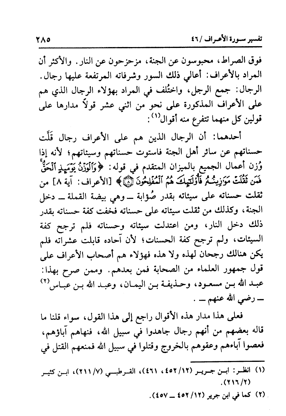 أحدهما: أن الرجال الذين هم على الأعراف رجال قَلَّت حسناتهم عن سائر أهل الجنة فاستوت حسناتهم وسيئاتهم؛ لأنه إذا وُزن أعمال الجميع بالميزان المتقدم في قوله: {وَالْوَزْنُ يَوْمَئِذٍ الْحَقُّ فَمَن ثَقُلَتْ مَوَازِينُهُ فَأُوْلَئِكَ هُمُ الْمُفْلِحُونَ (8)} [الأعراف: آية 8] من ثقلت حسناته على سيئاته بقدر صُؤابة -وهي بيضة القملة- دخل الجنة، وكذلك من ثقلت سيئاته على حسناته فخفت كفة حسناته بقدر ذلك دخل النار، ومن اعتدلت سيئاته وحسناته فلم ترجح كفة السيئات، ولم ترجح كفة الحسنات؛ لأن آحاده قابلت عشراته فلم يكن هنالك رجحان لهذه ولا هذه فهؤلاء هم أصحاب الأعراف على قول جمهور العلماء من الصحابة فمن بعدهم. وممن صرح بهذا: عبد الله بن مسعود، وحذيفة بن اليمان، وعبد الله بن عباس (¬2) رضي الله عنهم.
