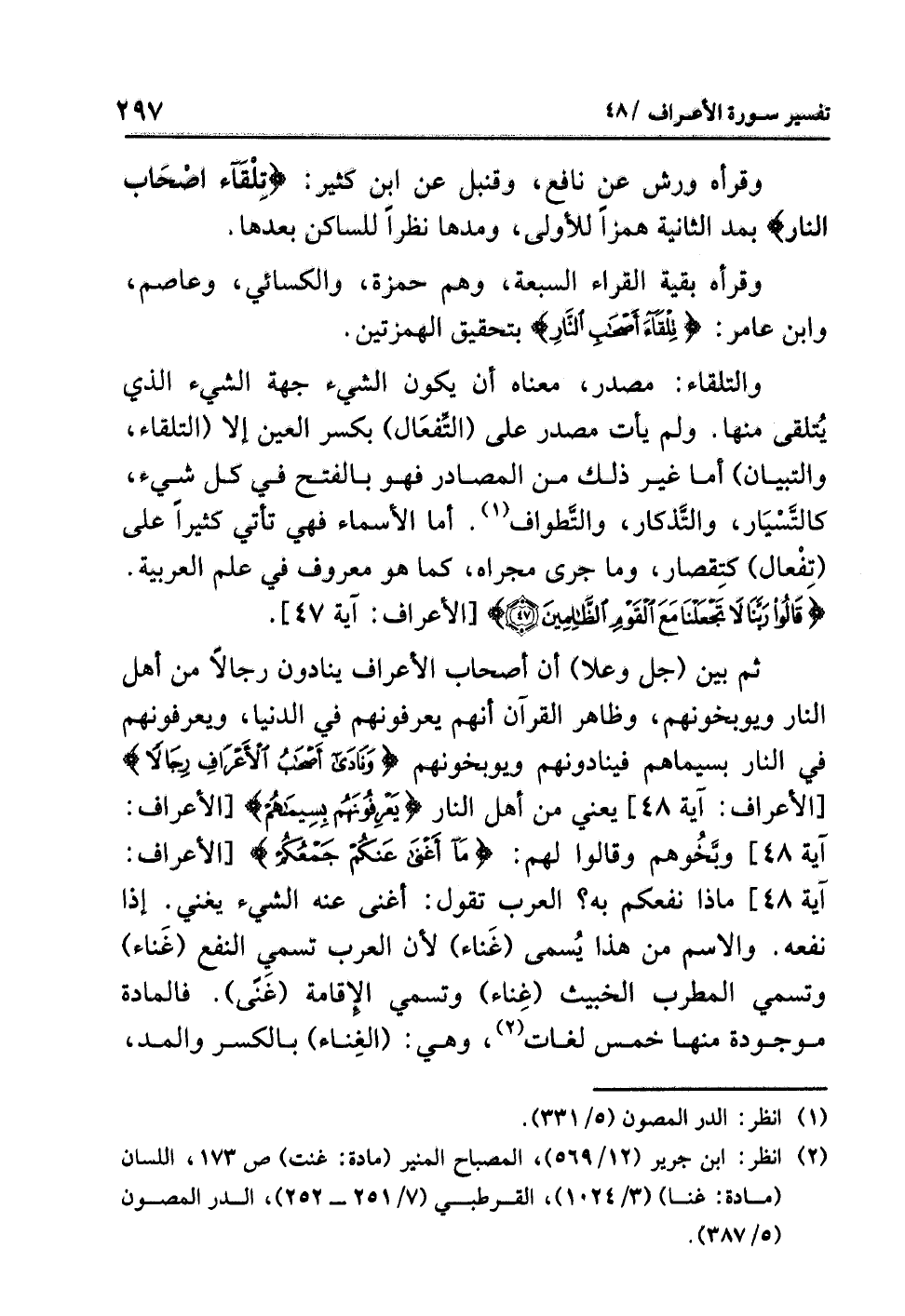 ثم بين (جل وعلا) أن أصحاب الأعراف ينادون رجالاً من أهل النار ويوبخونهم، وظاهر القرآن أنهم يعرفونهم في الدنيا، ويعرفونهم في النار بسيماهم فينادونهم ويوبخونهم {وَنَادَى أَصْحَابُ الأَعْرَافِ رِجَالاً} [الأعراف: آية 48] يعني من أهل النار {مَا أَغْنَى عَنكُمْ جَمْعُكُمْ} [الأعراف: آية 48] وبخُوهم وقالوا لهم: {مَا أَغْنَى عَنكُمْ جَمْعُكُمْ} [الأعراف: آية 48] ماذا نفعكم به؟ العرب تقول: أغنى عنه الشيء يغني: إذا نفعه. والاسم من هذا يُسمى (غَناء) لأن العرب تسمي النفع (غَناء) وتسمي المطرب الخبيث (غِناء) وتسمي الإقامة (غَنىً). فالمادة موجودة منها خمس لغات (¬2)، وهي: (الغِناء) بالكسر والمد،