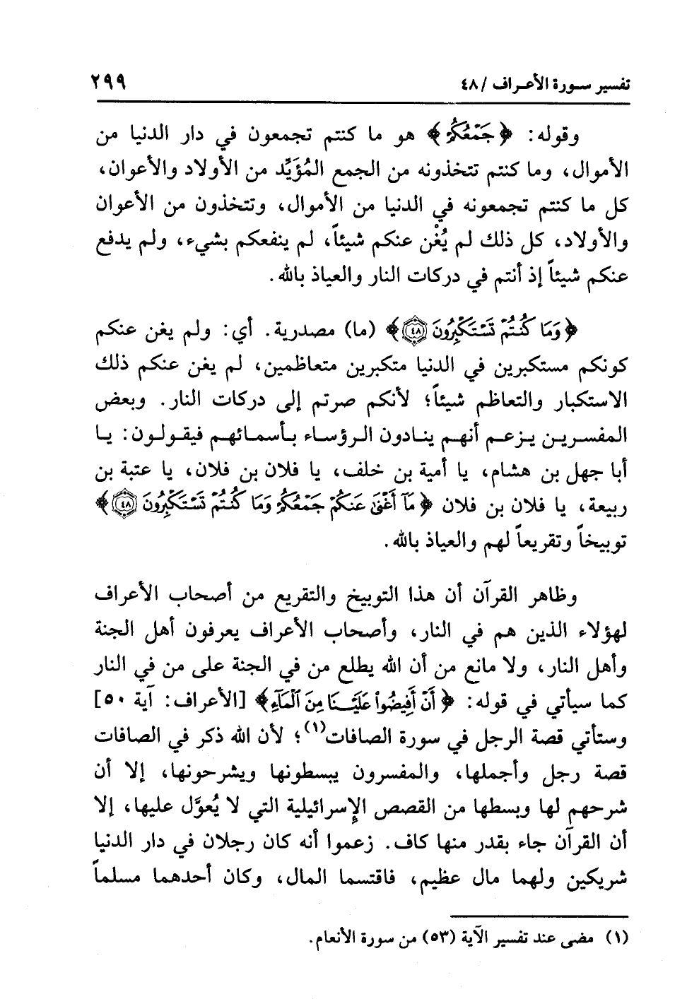 {وَمَا كُنتُمْ تَسْتَكْبِرُونَ} (ما) مصدرية. أي: ولم يغن عنكم كونكم مستكبرين في الدنيا متكبرين متعاظمين، لم يغن عنكم ذلك الاستكبار والتعاظم شيئاً؛ لأنكم صِرْتُمْ إلى دركات النار. وبعض المفسرين يزعم أنهم ينادون الرؤساء بأسمائِهِمْ فيقولون: يا أبا جهل بن هشام، يا أمية بن خلف، يا فلان بن فلان، يا عتبة بن ربيعة، يا فلان بن فلان {مَا أَغْنَى عَنكُمْ جَمْعُكُمْ وَمَا كُنتُمْ تَسْتَكْبِرُونَ} توبيخاً وتقريعاً لهم والعياذ بالله.