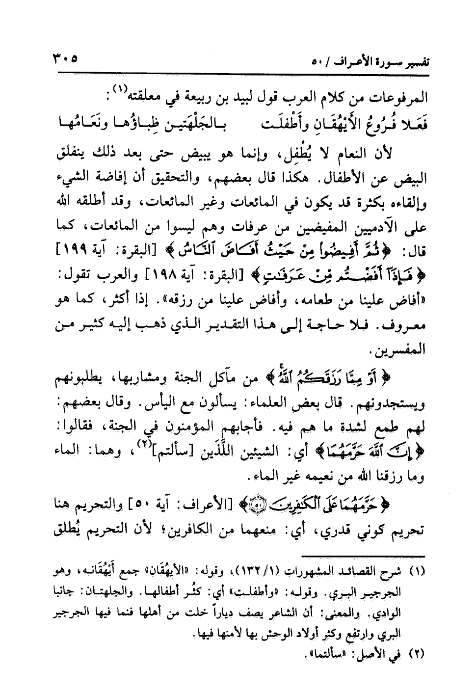 (¬1) شرح القصائد المشهورات (1/ 132). وقوله: «الأيهُقَان» جمع أَيهُقانة، وهو الجرجير البري. وقوله: «وأطفلت» أي: كثُر أطفالها. والجلهتان: جانبا الوادي. والمعنى: أن الشاعر يصف دياراً خلت من أهلها فنما فيها الجرجير البري وارتفع وكثر أولاد الوحش بها لأمنها فيها.