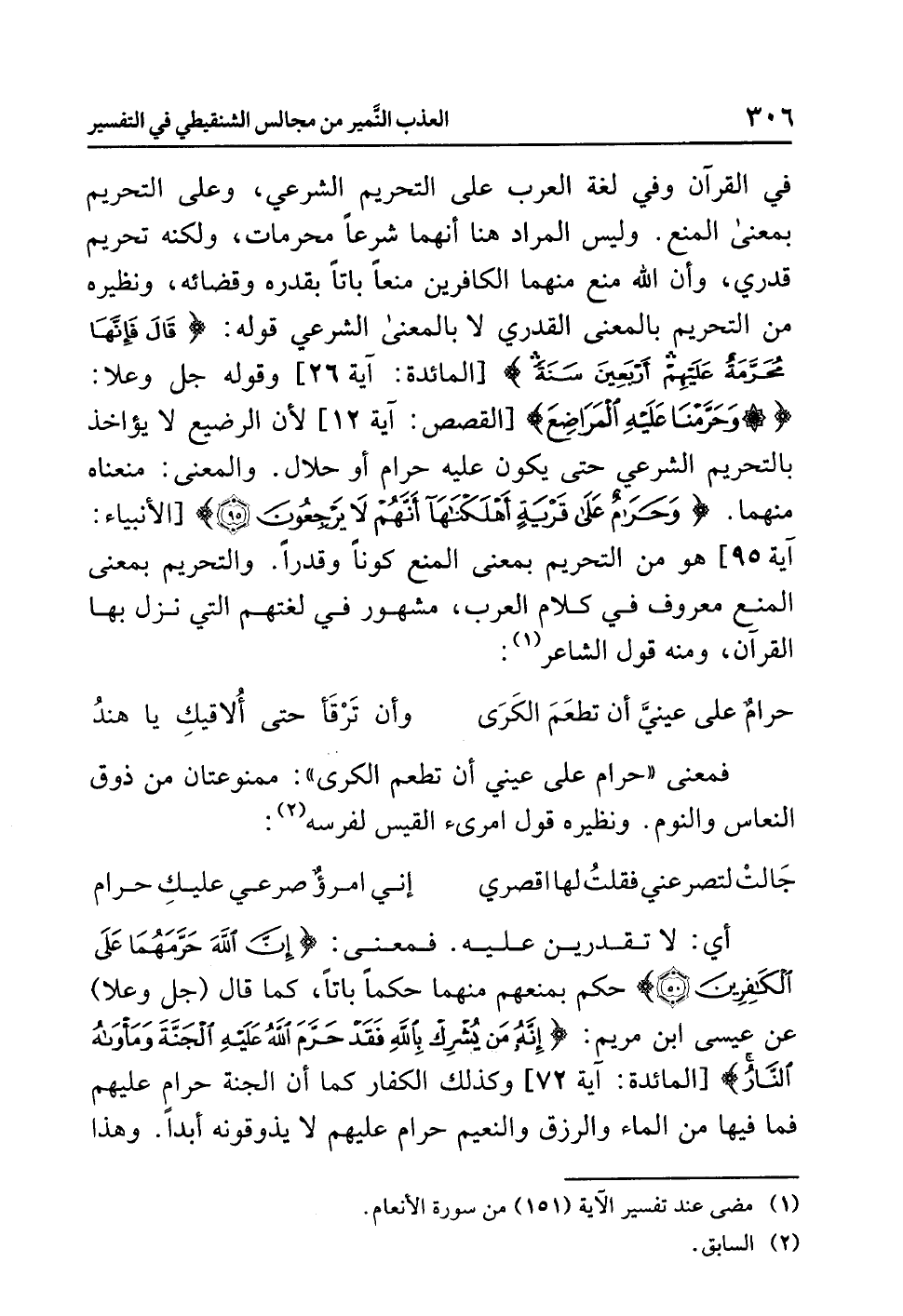 في القرآن وفي لغة العرب على التحريم الشرعي، وعلى التحريم بمعنى المنع. وليس المراد هنا أنهما شرعاً محرمات، ولكنه تحريم قدري، وأن الله منع منهما الكافرين منعاً باتّاً بقدره وقضائه، ونظيره من التحريم بالمعنى القدري لا بالمعنى الشرعي قوله: {قَالَ فَإِنَّهَا مُحَرَّمَةٌ عَلَيْهِمْ أَرْبَعِينَ سَنَةً} [المائدة: آية 26] وقوله جل وعلا: {وَحَرَّمْنَا عَلَيْهِ الْمَرَاضِعَ} [القصص: آية 12]؛ لأن الرضيع لا يؤاخذ بالتحريم الشرعي حتى يكون عليه حرام أو حلال. والمعنى: منعناه منهما. {وَحَرَامٌ عَلَى قَرْيَةٍ أَهْلَكْنَاهَا أَنَّهُمْ لاَ يَرْجِعُونَ (95)} [الأنبياء: آية 50] هو من التحريم بمعنى المنع كوناً وقدراً. والتحريم بمعنى المنع معروف في كلام العرب، مشهور في لغتهم التي نزل بها القرآن، ومنه قول الشاعر (¬1):