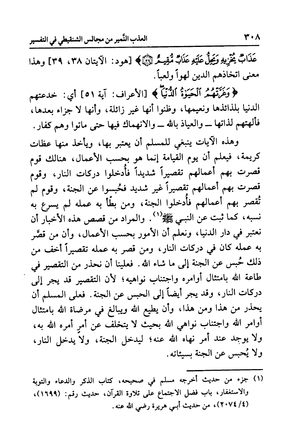 صلى الله عليه وسلم. والمراد من قصص هذه الأخبار أن نعتبر في دار الدنيا، ونعلم أن الأمور بحسب الأعمال، وأن من قصّر به عمله كان في دركات النار، ومن قصر به عمله تقصيراً أخف من ذلك حُبس عن الجنة إلى ما شاء الله. فعلينا أن نحذر من التقصير في طاعة الله بامتثال أوامره واجتناب نواهيه؛ لأن التقصير قد يجر إلى دركات النار، وقد يجر أيضاً إلى الحبس عن الجنة. فعلى المسلم أن يحذر من هذا ومن هذا، وأن يطيع الله ويبالغ في مرضاة الله بامتثال أوامر الله واجتناب نواهي الله بحيث لا يتخلف عن أمرٍ أمره الله به، ولا يوجد عند أمر نهاه الله عنه؛ ليدخل الجنة، ولا يدخل النار، ولا يُحبس عن الجنة بسيئاته.