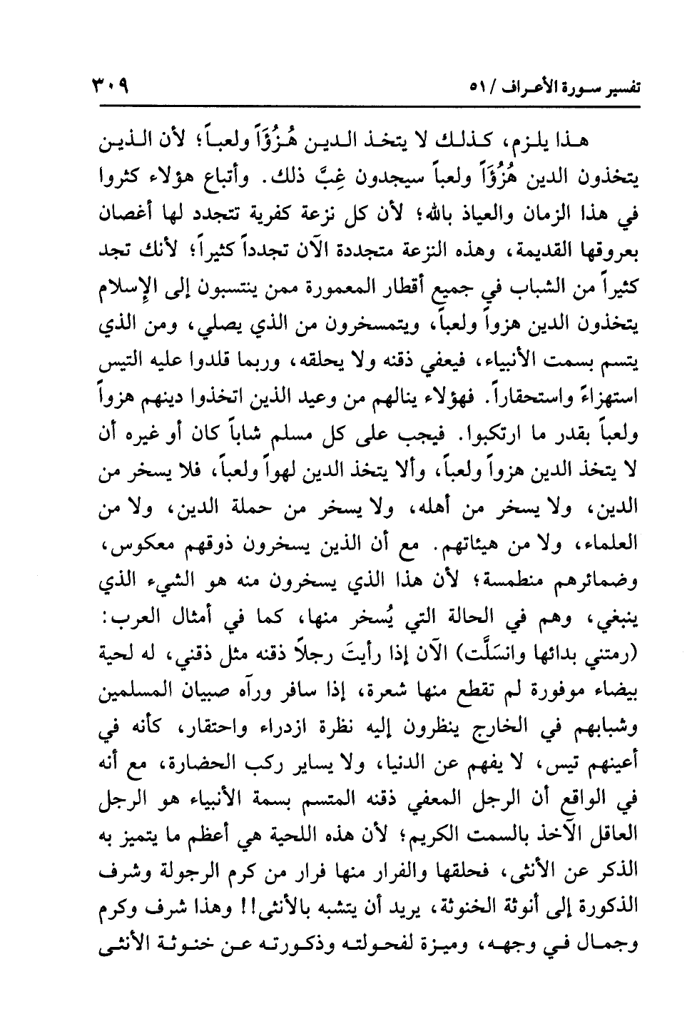 هذا يلزم، كذلك لا يتخذ الدين هُزُؤاً ولعباً؛ لأن الذين يتخذون الدين هُزُؤًا ولعباً سيجدون غِبَّ ذلك. وأتباع هؤلاء كثروا في هذا الزمان والعياذ بالله؛ لأن كل نزعة كفرية تتجدد لها أغصان بعروقها القديمة، وهذه النزعة متجددة الآن تجدداً كثيراً؛ لأنك تجد كثيراً من الشباب في جميع أقطار المعمورة ممن ينتسبون إلى الإسلام يتخذون الدين هزؤاً ولعباً، ويتمسخرون من الذي يصلي، ومن الذي يتسم بسمت الأنبياء، فيعفي ذقنه ولا يحلقه، وربما قلدوا عليه التيس استهزاءً واستحقاراً، فهؤلاء ينالهم من وعيد الذين اتخذوا دينهم هزؤاً ولعباً بقدر ما ارتكبوا، فيجب على كل مسلم شابّاً كان أو غيره أن لا يتخذ الدين هزواً ولعباً، وألا يتخذ الدين لهواً ولعباً، فلا يسخر من الدين، ولا يسخر من أهله، ولا يسخر من حملة الدين، ولا من العلماء، ولا من هيئاتهم. مع أن الذين يسخرون ذوقهم معكوس، وضمائرهم منطمسة؛ لأن هذا الذي يسخرون منه هو الشيء الذي ينبغي، وهم في الحالة التي يُسخر منها، كما في أمثال العرب: (رمتني بدائها وانسَلَّت) الآن إذا رأيتَ رجلاً ذقنه مثل ذقني، له لحية بيضاء موفورة لم تقطع منها شعرة، إذا سافر ورآه صبيان المسلمين وشبابهم في الخارج ينظرون إليه نظرة ازدراء واحتقار، كأنه في أعينهم تيس، لا يفهم عن الدنيا، ولا يساير ركب الحضارة، مع أنه في الواقع أن الرجل المعفي ذقنه المتسم بسمة الأنبياء هو الرجل العاقل الآخذ بالسمت الكريم؛ لأن هذه اللحية هي أعظم ما يتميز به الذكر عن الأنثى، فحلقها والفرار منها فرار من كرم الرجولة وشرف الذكورة إلى أنوثة الخنوثة، يريد أن يتشبه بالأنثى!! وهذا شرف وكرم وجمال في وجهه، وميزة لفحولته وذكورته عن خنوثة الأنثى