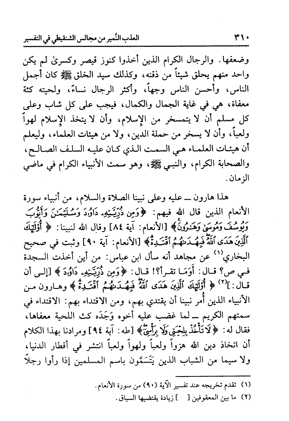 هذا هارون - عليه وعلى نبينا الصلاة والسلام- من أنبياء سورة الأنعام الذين قال الله فيهم: {وَمِن ذُرِّيَّتِهِ دَاوُودَ وَسُلَيْمَانَ وَأَيُّوبَ وَيُوسُفَ وَمُوسَى وَهَارُونَ} [الأنعام: آية 84] وقال الله لنبينا: {أُوْلَئِكَ الَّذِينَ هَدَى الله فَبِهُدَاهُمُ اقْتَدِهْ} [الأنعام: آية 90] وثبت في صحيح البخاري (¬1) عن مجاهد أنه سأل ابن عباس: من أين أخذت السجدة في ص؟ قال: أوَمَا تقرأ؟! قال: {وَمِن ذُرِّيَّتِهِ دَاوُودَ} [إلى أن قال:] (¬2) {أُوْلَئِكَ الَّذِينَ هَدَى الله فَبِهُدَاهُمُ اقْتَدِهْ} وهارون من الأنبياء الذين أمر نبينا أن يقتدي بهم، ومن الاقتداء بهم: الاقتداء في سمتهم الكريم - لما غضب عليه أخوه وَجَدَه كث اللحية معفاها، فقال له: {لاَ تَأْخُذْ بِلِحْيَتِي وَلاَ بِرَأْسِي} [طه: آية 94] ومرادنا بهذا الكلام أن اتخاذ دين الله هزواً ولعباً ولهواً ولعباً انتشر في أقطار الدنيا، ولا سيما من الشباب الذين يَتَسَمَّون باسم المسلمين إذا رأوا رجلاً