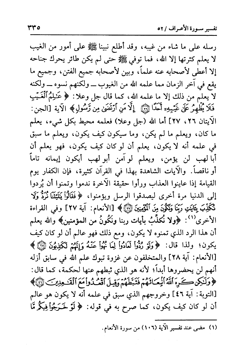 رسلَه على ما شاءَ من غَيْبِهِ، وقد أَطْلَعَ نَبِيَّنَا صلى اللَّهُ عليه وسلم على أمورٍ من الغيبِ لاَ يعلمُ كثرتَها إلا اللَّهُ، فما تُوُفِّيَ صلى الله عليه وسلم حتى لم يكن طائرٌ يُحَرِّكُ جناحه إلا أعطى لأصحابِه عنه عِلْمًا، وَبَيَّنَ لأصحابِه جميعَ الفتنِ، وجميعَ ما يقعُ في آخِرِ الزمانِ مِمَّا عَلَّمَهُ اللَّهُ من الغيوبِ - ولكنهم نَسُوهُ - ولكنه لا يَعْلَمُ من ذلك إلا ما عَلَّمَهُ اللَّهُ، كما قال جل وعلا: {عَالِمُ الْغَيْبِ فَلاَ يُظْهِرُ عَلَى غَيْبِهِ أَحَدًا (26) إِلاَّ مَنِ ارْتَضَى مِن رَّسُولٍ} الآيةَ [الجن: الآيتان 26، 27] أما اللَّهُ (جل وعلا) فَعِلْمُهُ محيطٌ بكلِّ شيءٍ، يعلمُ ما كان، ويعلمُ ما لم يكن، وما سيكونُ كيف يكونُ ويعلمُ ما سبقَ في علمِه أنه لا يكونُ، يعلمُ أن لو كان كيف يكونُ، فهو يعلمُ أن أبا لهبٍ لَنْ يؤمنَ، ويعلمُ لو آمَنَ أبو لهبٍ أيكونُ إيمانُه تَامًّا أو ناقصًا. والآياتُ الشاهدةُ بهذا في القرآنِ كثيرةٌ، فإن الكفارَ يومَ القيامةِ إذا عَايَنُوا العذابَ وَرَأَوْا حقيقةَ الآخرةِ نَدِمُوا وَتَمَنَّوْا أن يُرَدُّوا إلى الدنيا مرةً أخرى لِيُصَدِّقُوا الرسلَ ويؤمنوا: {فَقَالُوا يَا لَيْتَنَا نُرَدُّ وَلاَ نُكَذِّبَ بِآيَاتِ رَبِّنَا وَنَكُونَ مِنَ الْمُؤْمِنِينَ} [الأنعام: آية 27] وفي القراءةِ الأُخْرَى (¬1):