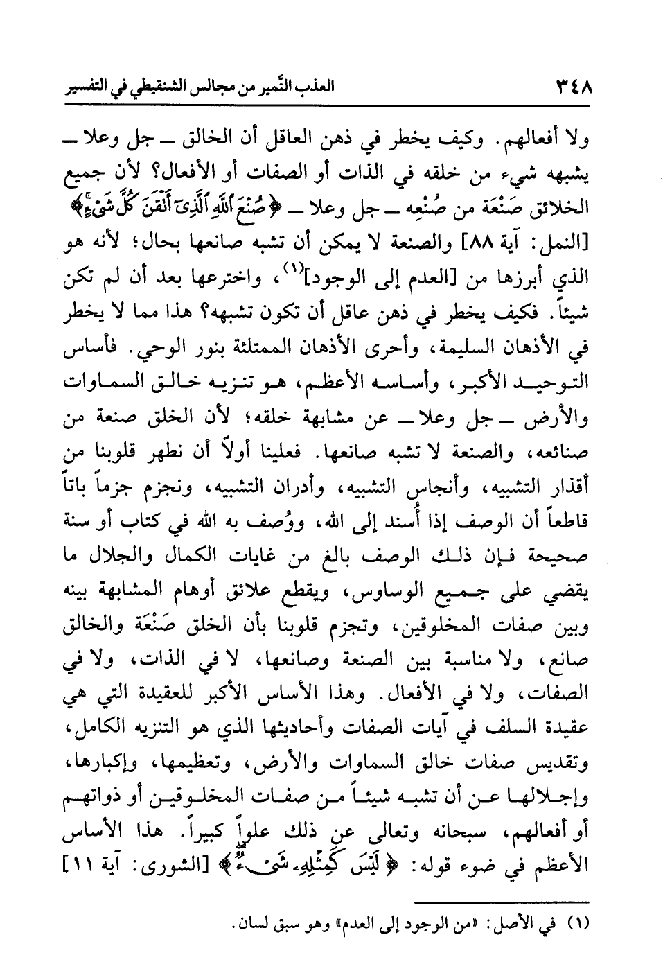 وهذا الأساسُ الأكبرُ للعقيدةِ التي هي عقيدةُ السلفِ في آياتِ الصفاتِ وأحاديثِها الذي هو التنزيهُ الكاملُ، وتقديسُ صفاتِ خالقِ السماواتِ والأرضِ وتعظيمُها وإكبارُها وإجلالُها عن أن تُشْبِهَ شيئًا من صفاتِ المخلوقين أو ذواتِهم أو أفعالِهم، سبحانه وتعالى عن ذلك عُلُوًّا كبيرًا. هذا الأَسَاسُ الأعظمُ في ضوءِ قولِه: {لَيْسَ كَمِثْلِهِ شَيْءٌ} [الشورى: آية 11]