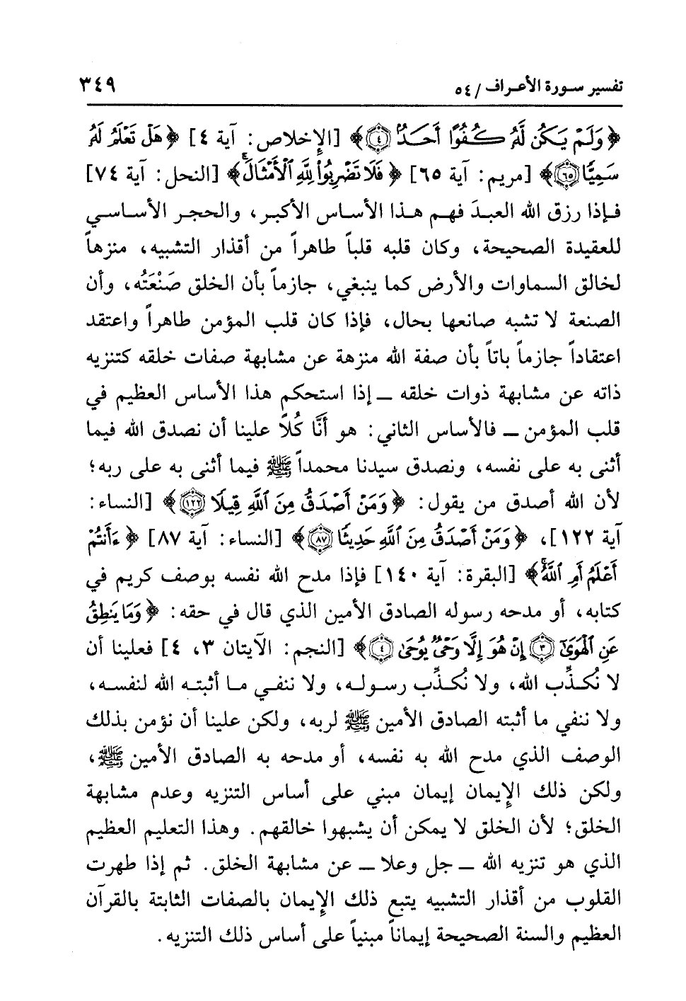 {وَلَمْ يَكُن لَّهُ كُفُوًا أَحَدٌ (4)} [الإخلاص: آية 4] {هَلْ تَعْلَمُ لَهُ سَمِيًّا} [مريم: آية 56] {فَلاَ تَضْرِبُوا لِلَّهِ الأَمْثَالَ} [النحل: آية 74] فإذا رَزَقَ اللَّهُ العبدَ فَهْمَ هذا الأساسِ الأكبرِ، والحجرِ الأساسيِّ للعقيدةِ الصحيحةِ، وكان قلبُه قلبًا طاهرًا من أقذارِ التشبيهِ، مُنَزِّهًا لخالقِ السماواتِ والأرضِ كما ينبغي، جازمًا بأن الخلقَ صَنْعَتُهُ، وأن الصنعةَ لاَ تُشْبِهُ صانعَها بحالٍ، فإذا كان قلبُ المؤمنِ طاهرًا واعتقدَ اعتقادًا جازمًا باتًّا بأن صفةَ اللَّهِ منزَّهة عن مشابهةِ صفاتِ خَلْقِهِ كتنزيهِه ذاتَه عن مشابهةِ ذواتِ خَلْقِهِ - إذا استحكم هذا الأساسُ العظيمُ في قلبِ المؤمنِ - فالأساسُ الثاني: هو أَنَّا كُلاًّ علينا أن نصدقَ اللَّهَ فيما أَثْنَى به على نفسه، ونصدقَ سيدنا محمدًا صلى الله عليه وسلم فيما أَثْنَى به على رَبِّهِ؛ لأن اللَّهَ أصدقُ مَنْ يقولُ: {وَمَنْ أَصْدَقُ مِنَ اللَّهِ قِيلاً} [النساء: آية 122] {وَمَنْ أَصْدَقُ مِنَ اللَّهِ حَدِيثًا} [النساء: آية 87] {أَأَنتُمْ أَعْلَمُ أَمِ اللَّهُ} [البقرة: آية 140] فإذا مَدَحَ اللَّهُ نفسَه بوصفٍ كريمٍ في كتابِه، أو مَدَحَهُ رسولُه الصادقُ الأمينُ الذي قال في حَقِّهِ: {وَمَا يَنْطِقُ عَنِ الْهَوَى (3) إِنْ هُوَ إِلاَّ وَحْيٌ يُوحَى (4)} [النجم: الآيتان 3، 4] فعلينا أن لا نُكذِّبَ اللَّهَ، ولا نُكذِّبَ رسولَه، ولا نَنْفِيَ ما أَثْبَتَهُ اللَّهُ لنفسِه، ولا ننفيَ ما أثبتَه الصادقُ الأمينُ صلى الله عليه وسلم لِرَبِّهِ، ولكن علينا أن نؤمنَ بذلك الوصفِ الذي مَدَحَ اللَّهُ به نفسَه، أو مَدَحَهُ به الصادقُ الأمينُ صلى الله عليه وسلم، ولكنَّ ذلك