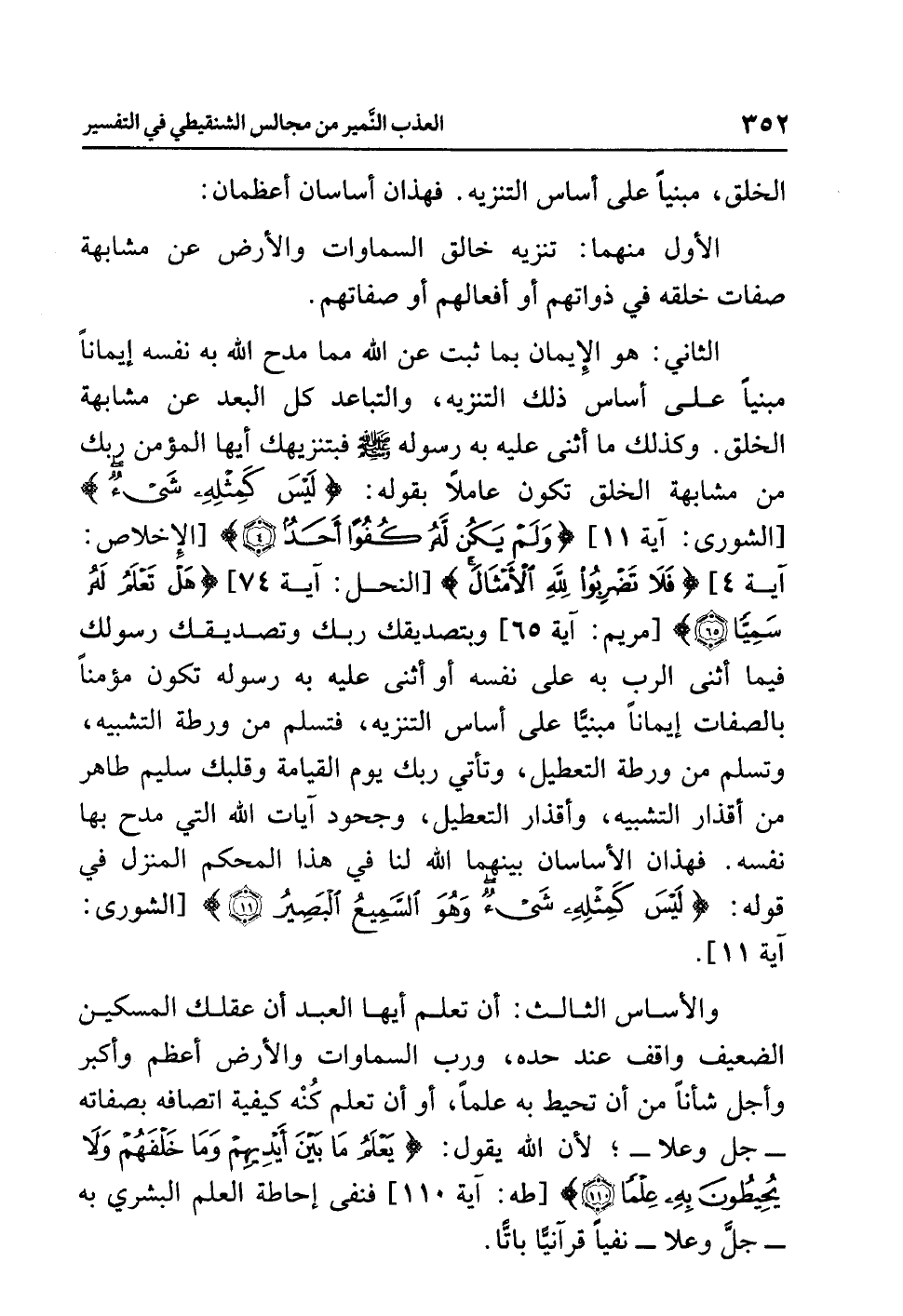 الثاني: هو الإيمانُ بما ثَبَتَ عن اللَّهِ مما مَدَحَ اللَّهُ به نفسَه إيمانًا مَبْنِيًّا على أساسِ ذلك التنزيهِ، والتباعدِ كُلَّ البعدِ عن مشابهةِ الخلقِ. وكذلك ما أَثْبَتَهُ عليه به رسولُه صلى الله عليه وسلم فبتنزيهك أيها المؤمنُ رَبَّكَ من مشابهةِ الخلقِ تكونُ عَامِلاً بقولِه: {لَيْسَ كَمِثْلِهِ شَيْءٌ} [الشورى: آية 11] {وَلَمْ يَكُن لَّهُ كُفُوًا أَحَدٌ (4)} [الإخلاص: آية 4] {فَلاَ تَضْرِبُوا لِلَّهِ الأَمْثَالَ} [النحل: آية 74] {هَلْ تَعْلَمُ لَهُ سَمِيًّا} [مريم: آية 6] وَبِتَصْدِيقِكَ رَبَّكَ وتصديقِك رسولَك فيما أَثْنَى الربُّ به على نفسِه أو أثنى عليه به رسولُه تكونُ مُؤْمِنًا بالصفاتِ إيمانًا مَبْنِيًّا على أساسِ التنزيهِ، فتسلمُ من ورطةِ التشبيهِ، وتسلمُ من ورطةِ التعطيلِ، وتأتي رَبَّكَ يومَ القيامةِ وقلبُك سليمٌ طاهرٌ من أقذارِ التشبيهِ، وأقذارِ التعطيلِ، وجحودِ آياتِ اللَّهِ التي مَدَحَ بها نَفْسَهُ. فهذانِ الأساسانِ بَيَّنَهُمَا اللَّهُ لنا في هذا الْمُحْكَمِ الْمُنَزَّلِ في قولِه: {لَيْسَ كَمِثْلِهِ شَيْءٌ وَهُوَ السَّمِيعُ البَصِيرُ} [الشورى: آية 11].