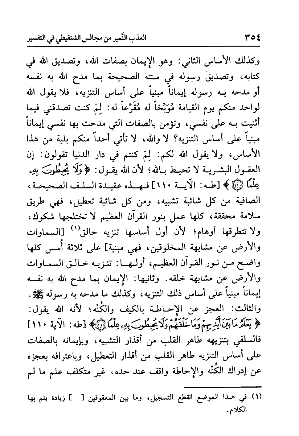 وكذلك الأساسُ الثاني: وهو الإيمانُ بصفاتِ اللَّهِ، وتصديقُ اللَّهِ في كتابِه، وتصديقُ رسولِه في سُنَّتِهِ الصحيحةِ بما مَدَحَ اللَّهُ به نفسَه أو مَدَحَهُ به رسولُه إيمانًا مَبْنِيًّا على أساسِ التنزيهِ، فلاَ يقولُ اللَّهُ لِوَاحِدٍ منكم يومَ القيامةِ مُوَبِّخًا له مُقَرِّعًا له: لِمَ كنتَ تصدقني فيما أَثْنَيْتُ به على نفسي، وتؤمنُ بالصفاتِ التي مدحتُ بها نفسي إيمانًا مَبْنِيًّا على أساسِ التنزيهِ؟ لا والله، لا تأتِي أحدًا منكم بَلِيَّةٌ من هذا الأساسِ، ولا يقولُ اللَّهُ لكم: لِمَ كنتُم في دارِ الدنيا تقولونَ: إن العقولَ البشريةَ لا تحيطُ بِاللَّهِ؛ لأَنَّ اللَّهَ يقولُ: {وَلاَ يُحِيطُونَ بِهِ عِلْمًا} [طه: الآية 110] فهذه عقيدةُ السلفِ الصحيحةُ، الصافيةُ من كُلِّ شائبةِ تشبيهٍ، وَمِنْ كُلِّ شائبةِ تعطيلٍ، فهي طريقُ سلامةٍ محققةٍ، كُلُّهَا عملٌ بنورِ القرآنِ العظيمِ لاَ تَخْتَلِجُهَا شكوكٌ، ولا تَتَطَرَّقُهَا أوهامٌ؛ لأن أولَ أساسِها تنزيهُ خالقِ (¬1) [السماواتِ والأرضِ عن مشابهةِ المخلوقين، فهي مبنيةٌ] على ثلاثةِ أُسُسٍ كُلُّهَا واضحٌ من نورِ القرآنِ العظيمِ، أولها: تنزيهُ خالقِ السماواتِ والأرضِ عن مشابهةِ خَلْقِهِ.