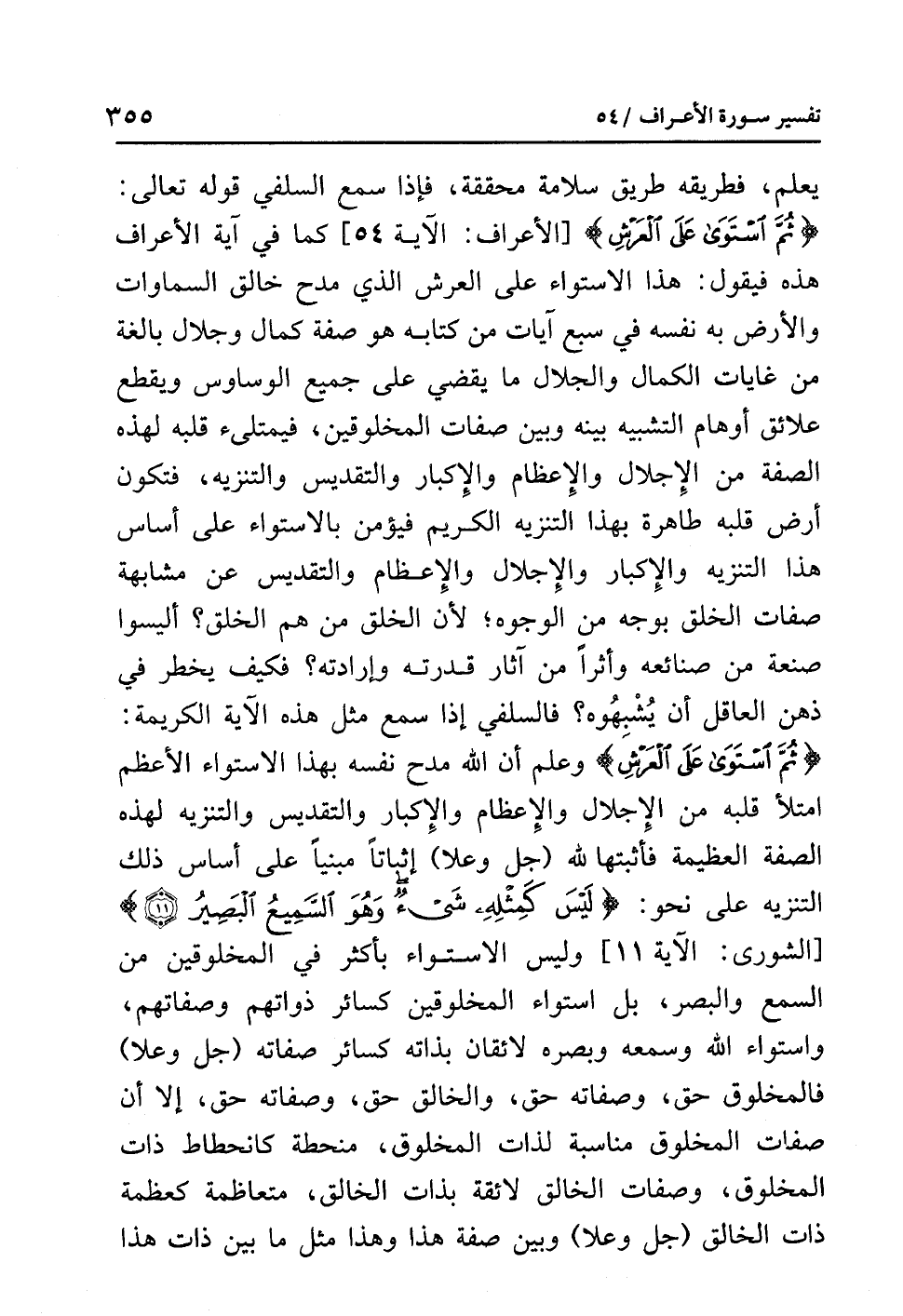 فالسلفيُّ إذا سَمِعَ مثلَ هذه الآيةِ الكريمةِ: {ثُمَّ اسْتَوَى عَلَى الْعَرْشِ} وَعَلِمَ أَنَّ اللَّهَ مَدَحَ نفسَه بهذا الاستواءِ الأعظمِ امتلأَ قلبُه من الإجلالِ والإعظامِ والإكبارِ والتقديسِ والتنزيهِ لهذه الصفةِ العظيمةِ فَأَثْبَتَهَا لِلَّهِ (جل وعلا) إِثْبَاتًا مَبْنِيًّا على أساسِ ذلك التنزيهِ على نحوِ: {لَيْسَ كَمِثْلِهِ شَيْءٌ وَهُوَ السَّمِيعُ البَصِيرُ} [الشورى: الآية 11] وليسَ الاستواءُ بأكثرَ في المخلوقين من السمعِ والبصرِ، بل استواءُ المخلوقين كسائرِ ذواتِهم وصفاتِهم، واستواءُ اللَّهِ وَسَمْعُهُ وبصرُه لائقانِ بذاتِه كسائرِ صفاتِه (جل وعلا) فالمخلوقُ حَقٌّ، وصفاتُه حَقٌّ، والخالقُ حَقٌّ، وصفاتُه حَقٌّ، إلا أن صفاتِ المخلوقِ مُنَاسِبَةٌ لذاتِ المخلوقِ، مُنْحَطَّةٌ كانحطاطِ ذاتِ المخلوقِ، وصفاتُ الخالقِ لائقةٌ بذاتِ الخالقِ، مُتَعَاظِمَةٌ كعظمةِ ذاتِ الخالقِ (جل وعلا) وَبَيْنَ صفةِ هذا وهذا مثلُ ما بينَ ذاتِ هذا
