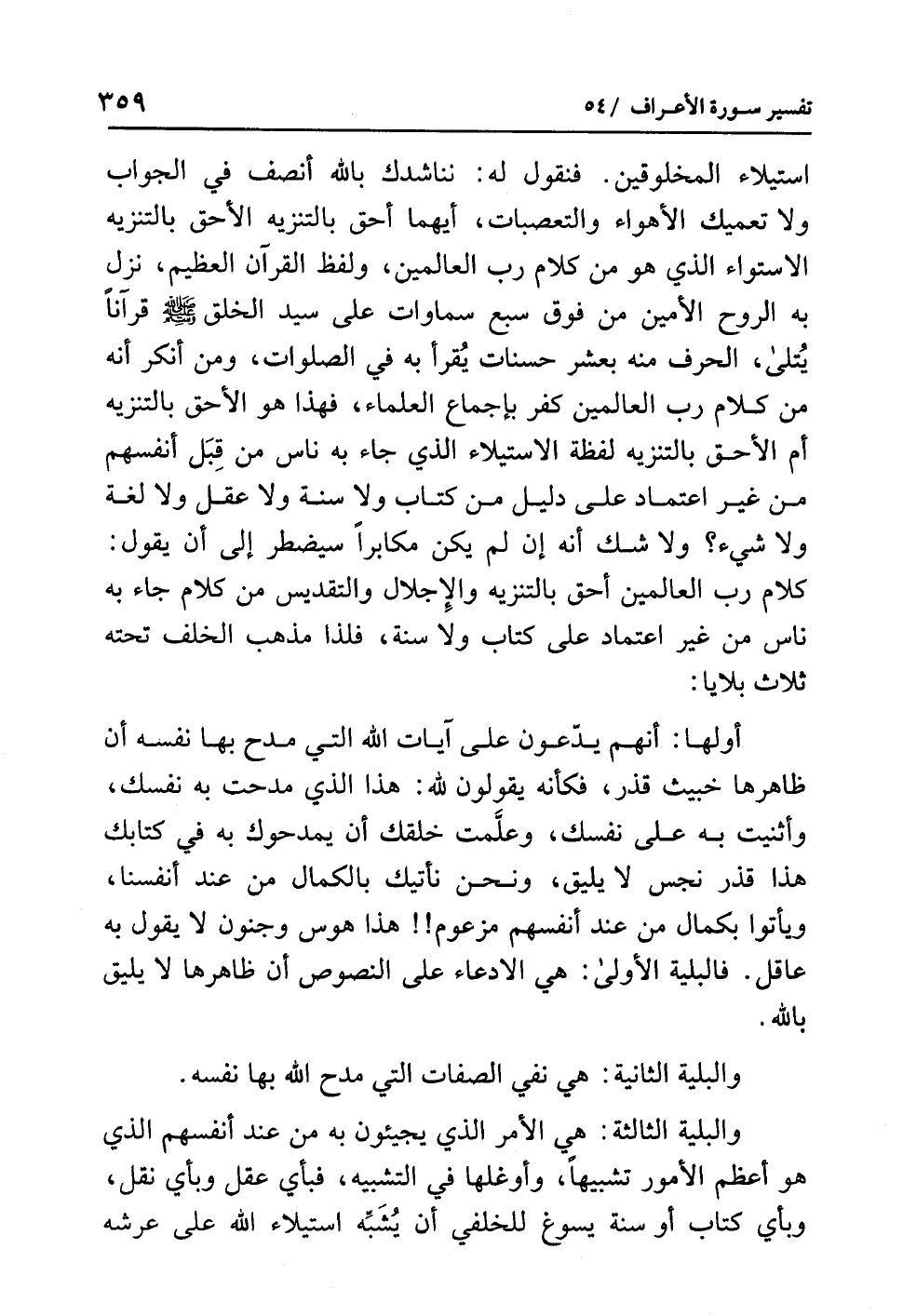 فنقول له: نناشدكَ اللَّهَ أَنْصِفْ في الجوابِ ولا تُعْمِيكَ الأهواءُ والتعصباتُ، أيهما أحقُّ بالتنزيهِ، الأحقُّ بالتنزيهِ الاستواءُ الذي هو من كلامِ رَبِّ العالمين، ولفظ القرآنِ العظيمِ، نَزَلَ به الروحُ الأمينُ من فوقِ سبعِ سماواتٍ على سيدِ الخلقِ صلى الله عليه وسلم قُرْآنًا يُتْلَى، الحرفُ منه بعشرِ حسناتٍ يُقْرَأُ به في الصلواتِ، وَمَنْ أَنْكَرَ أنه من كلامِ رَبِّ العالمين كَفَرَ بإجماعِ العلماءِ، فهذا هو الأحقُّ بالتنزيهِ أَمِ الأحقُّ بالتنزيهِ لفظةُ الاستيلاءِ الذي جاء به ناسٌ مِنْ قِبَلِ أنفسِهم من غيرِ اعتمادٍ على دليلٍ من كتابٍ وَلاَ سُنَّةٍ ولا عقلٍ ولا لغةٍ ولا شيءٍ؟ ولا شكَّ أنه إن لم يكن مُكَابِرًا سيضطر إلى أن يقولَ: كلامُ رَبِّ العالمين أَحَقُّ بالتنزيهِ والإجلالِ والتقديسِ من كلامٍ جاءَ به ناسٌ من غيرِ اعتمادٍ على كتابٍ ولا سُنَّةٍ؛ فَلِذَا مذهبُ الخلفِ تحتَه ثلاثُ بَلاَيَا: