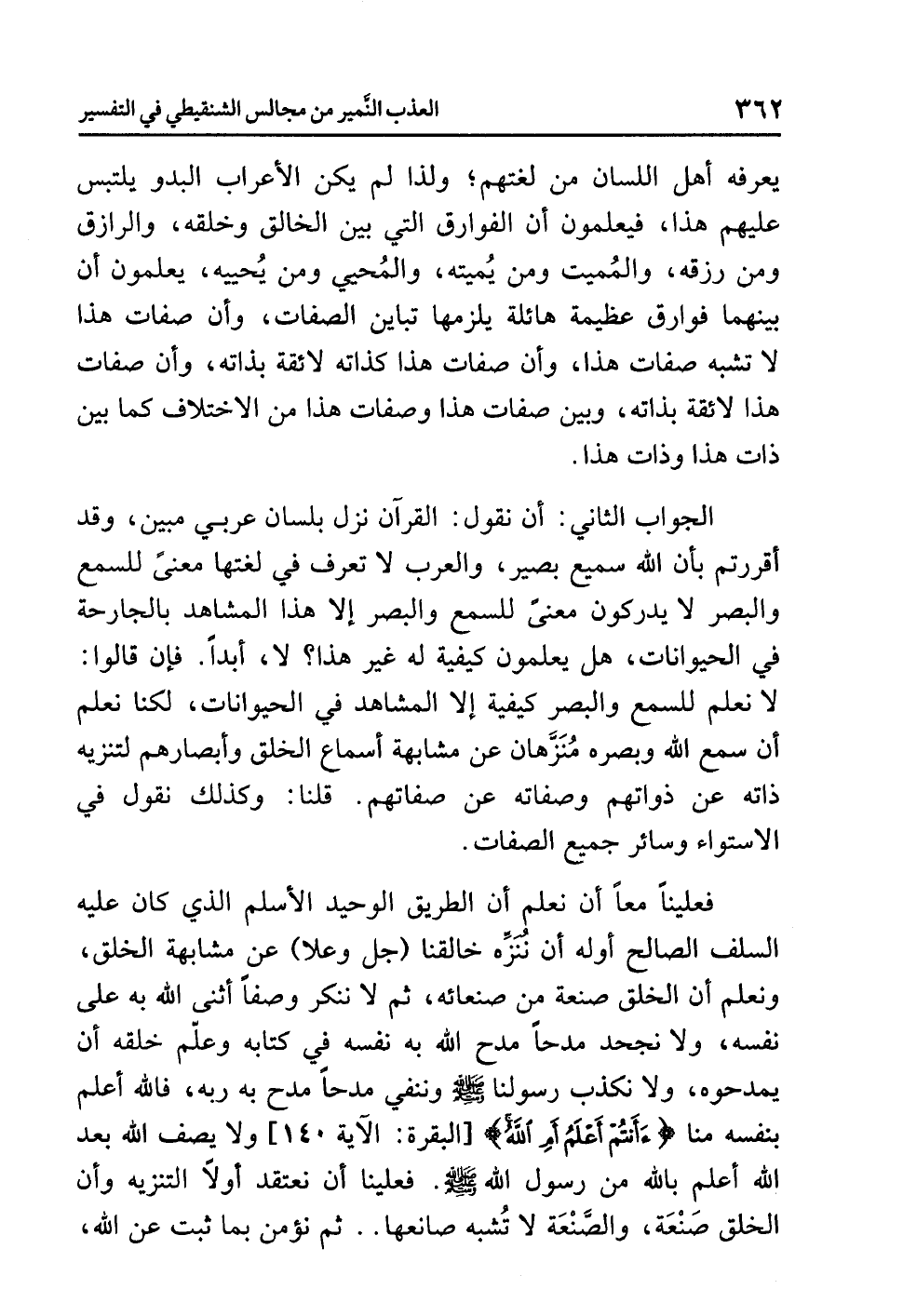 الجوابُ الثاني: أن نقولَ: القرآنُ نزلَ بلسانٍ عربيٍّ مبينٍ، وقد أقررتُم بأن اللَّهَ سميعٌ بصيرٌ، والعربُ لا تَعْرِفُ في لغتِها معنًى للسمعِ والبصرِ لا يُدْرِكُونَ معنًى للسمعِ والبصرِ إلا هذا الْمُشَاهَدَ بالجارحةِ في الحيواناتِ، هل يعلمونَ كيفيةً له غيرَ هذا؟ لا، أبدًا.