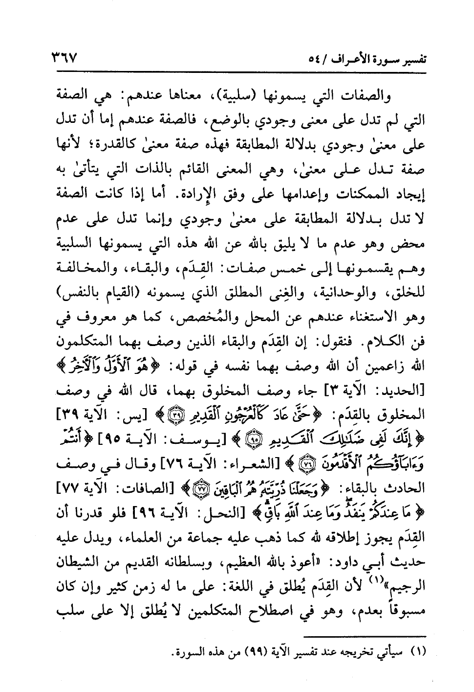 أما إذا كانت الصفةُ لا تدلُّ بدلالةِ المطابقةِ على معنًى وجوديٍّ وإنما تدلُّ على عَدَمٍ مَحْضٍ وهو عدمُ مَا لاَ يليقُ بِاللَّهِ عن اللَّهِ هذه التي يسمونَها السلبيةَ وهم يقسمونَها إلى خمسِ صفاتٍ: القِدَم والبقاءِ والمخالفةِ للخلقِ والوحدانيةِ والغِنَى المطلقِ الذي يسمونَه (القيامَ بالنفسِ) وهو الاستغناءُ عندَهم عن المحلِّ والمُخَصَّصِ، كما هو معروفٌ في فَنِّ الكلامِ. فنقولُ: إن القِدَمَ والبقاءَ الذين وَصَفَ بهما المتكلمونَ اللَّهَ زاعمينَ أن اللَّهَ وصفَ بهما نفسَه في قولِه: {هُوَ الْأَوَّلُ وَالْآخِرُ} [الحديد: الآية 3] جاء وصفُ المخلوقِ بهما، قال اللَّهُ في وصفِ المخلوقِ بالقِدَمِ: {حَتَّى عَادَ كَالْعُرْجُونِ الْقَدِيمِ} [يس: الآية 39] {إِنَّكَ لَفِي ضَلاَلِكَ الْقَدِيمِ} [يوسف: الآية 95] {أَنتُمْ وَآبَاؤُكُمُ الْأَقْدَمُونَ (76)} [الشعراء: الآية 76] وقال في وصفِ الحادثِ بالبقاءِ: {وَجَعَلْنَا ذُرِّيَّتَهُ هُمْ الْبَاقِينَ (77)} [الصافات: الآية 77] {مَا عِنْدَكُمْ يَنْفَدُ وَمَا عِنْدَ اللَّهِ بَاقٍ} [النحل: الآية 96] فلو قَدَّرْنَا أن القِدَمَ يجوزُ إطلاقُه لِلَّهِ كما ذهبَ إليه جماعةٌ من العلماءِ، ويدلُّ عليه حديثُ أبِي داودَ: «أَعُوذُ بِاللَّهِ الْعَظِيمِ، وَبِسُلْطَانِهِ الْقَدِيمِ مِنَ الشَّيْطَانِ الرَّجِيمِ» (¬1) لأن القِدَمَ يُطْلَقُ في اللغةِ: على ما له زمنٌ كثيرٌ وإن كان مَسْبُوقًا بِعَدَمٍ، وهو في اصطلاحِ المتكلمينَ لاَ يُطْلَقُ إلا على سَلْبِ