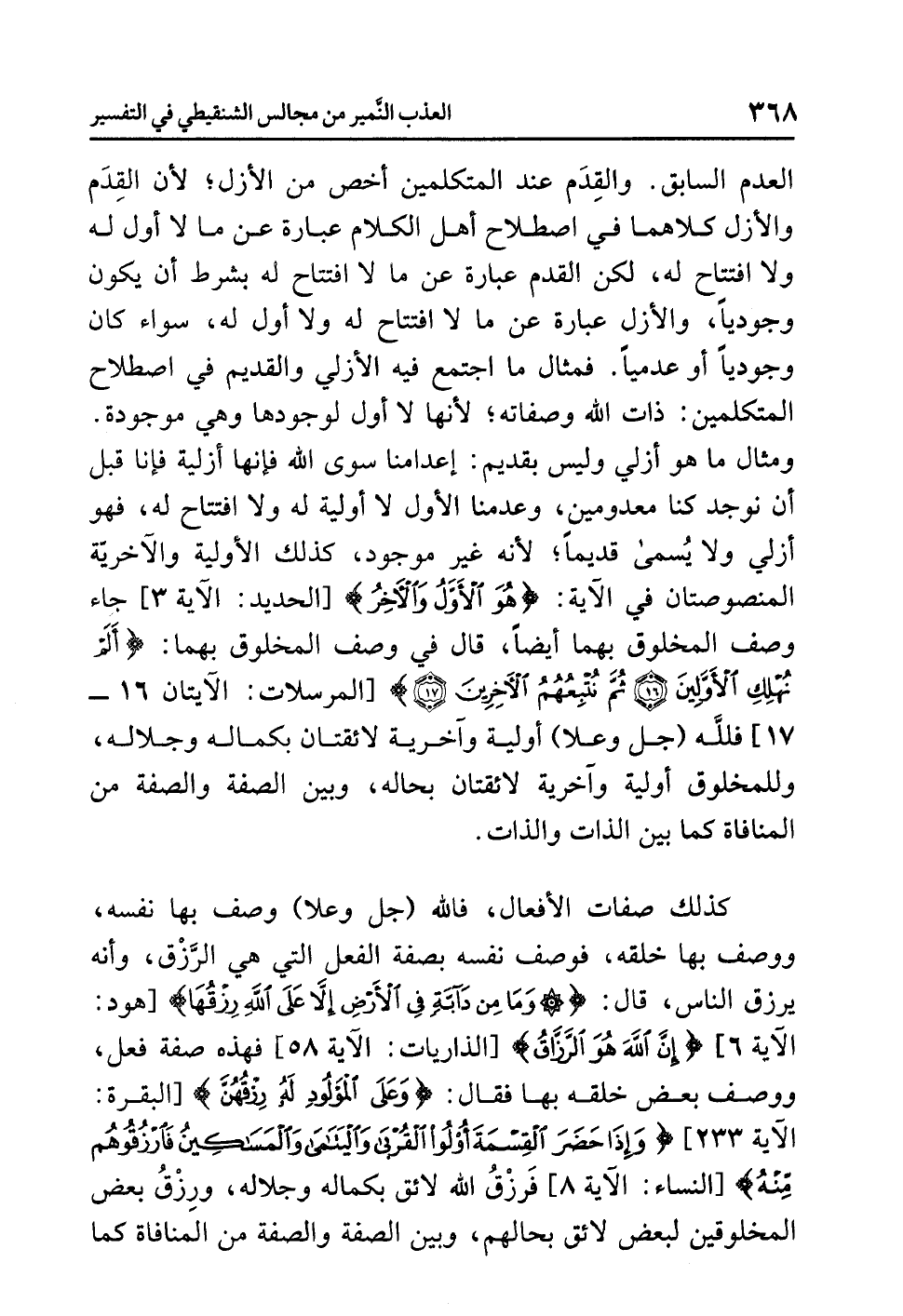 والقِدَمُ عندَ المتكلمين أَخَصُّ من الأزلِ؛ لأَنَّ القِدَمَ والأزلَ كلاهما في اصطلاحِ أهلِ الكلامِ عبارةٌ عن ما لاَ أولَ له ولا افتتاحَ له، لكن الْقِدَمَ عبارةٌ عن ما لاَ افتتاحَ له بشرطِ أن يكونَ وجوديًّا، والأزلُ عبارةٌ عن ما لاَ افتتاحَ له ولا أولَ له، سواء كان وجوديًّا أو عدميًّا. فمثالُ ما اجتمعَ فيه الأزليُّ والقديمُ في اصطلاحِ المتكلمين: ذاتُ اللَّهِ وصفاتُه؛ لأنها لا أولَ لوجودِها وهي موجودةٌ. ومثالُ ما هو أَزَلِيٌّ وليس بقديمٍ: أَعْدَامُنَا سوى اللَّهِ فإنها أزليةٌ فإنا قبلَ أن نوجدَ كنا معدومين، وعدمُنا الأولُ لا أوليةَ له ولا افتتاحَ له، فهو أزليٌّ ولاَ يُسَمَّى قَدِيمًا؛ لأنه غيرُ موجودٍ، كذلك الأوليةُ والآخريَّةُ المنصوصتانِ في الآيةِ: {هُوَ الْأَوَّلُ وَالْآخِرُ} [الحديد: الآية 3] جاءَ وصفُ المخلوقِ بها أيضًا، قال في وصفِ المخلوقِ بِهِمَا: {أَلَمْ نُهْلِكِ الْأَوَّلِينَ (16) ثُمَّ نُتْبِعُهُمُ الْآخِرِينَ (17)} [المرسلات: الآيتان 16 - 17] فَلِلَّهِ (جل وعلا) أوليةٌ وآخريةٌ لائقتانِ بكمالِه وجلالِه، وللمخلوقِ أوليةٌ وآخريةٌ لائقتانِ بحالِه، وبينَ الصفةِ والصفةِ من المنافاةِ كما
