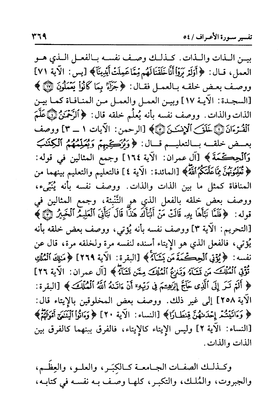 ووصفَ بعضَ خلقِه بالتعليمِ قال: {وَيُزَكِّيهِمْ وَيُعَلِّمُهُمُ الْكِتَابَ وَالْحِكْمَةَ} [آل عمران: الآية 164] وَجَمَعَ المثالين في قولِه: {تُعَلِّمُونَهُنَّ مِمَّا عَلَّمَكُمُ} [المائدة: الآية 4] فالتعليمُ والتعليمُ بينَهما من المنافاةِ كمثلِ ما بينَ الذاتِ والذاتِ. ووصفَ نفسَه بأنه يُنَبِّئُ، ووصفَ بعضَ خلقِه بالفعلِ الذي هو التَّنْبِئَةُ، وجمعَ المثالين في قولِه: {فَلَمَّا نَبَّأَهَا بِهِ قَالَتْ مَنْ أَنْبَأَكَ هَذَا قَالَ نَبَّأَنِيَ الْعَلِيمُ الْخَبِيرُ} [التحريم: الآية 3] ووصفَ نفسَه بأنه يُؤْتِي، ووصفَ بعضَ خلقِه بأنه يُؤْتِي، فالفعلُ الذي هو الإيتاءُ أسندَه لنفسِه مرةً ولخلقِه مرةً، قال عن نفسِه: {يُؤْتِي الْحِكْمَةَ مَنْ يَشَاءُ} [البقرة: الآية 269] {مَالِكَ الْمُلْكِ تُؤْتِي الْمُلْكَ مَنْ تَشَاءُ وَتَنْزِعُ الْمُلْكَ مِمَّنْ تَشَاءُ} [آل عمران: الآية 26] {أَلَمْ تَرَ إِلَى الَّذِي حَاجَّ إِبْرَاهِيمَ فِي رِبِّهِ أَنْ آتَاهُ اللَّهُ الْمُلْكَ} [البقرة: الآية 258] إلى غيرِ ذلك.