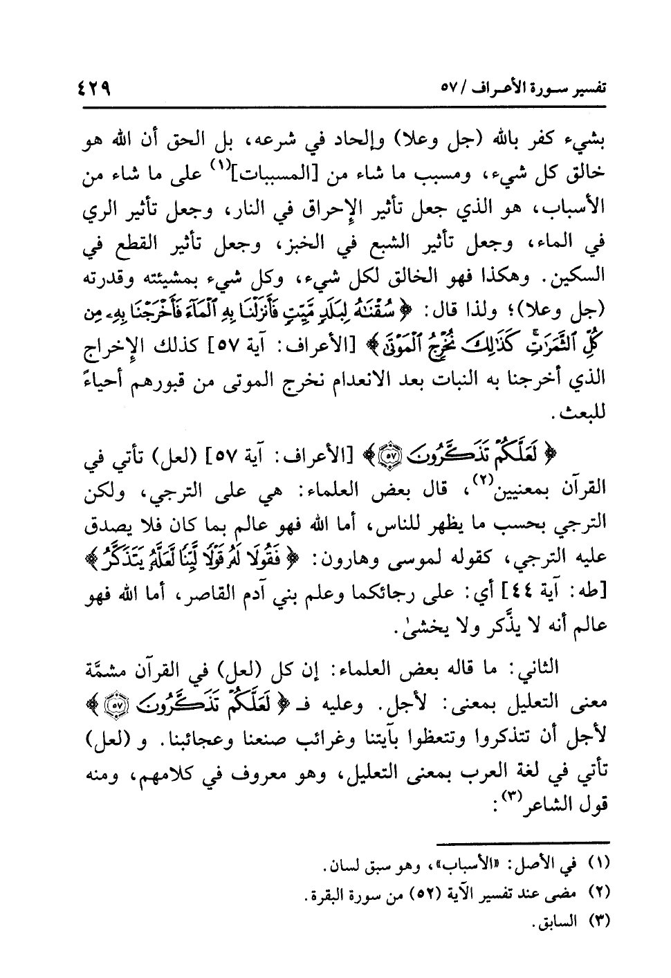 بشيءٍ كُفْرٌ باللهِ (جل وعلا) وإلحادٌ في شَرْعِهِ، بل الحقُّ أن اللهَ هو خالقُ كُلِّ شيءٍ، ومسببُ ما شاءَ من [المسببات] (¬1) على ما شاءَ من الأسبابِ، هو الذي جَعَلَ تأثيرَ الإحراقِ في النارِ، وجعلَ تأثيرَ الريِّ في الماءِ، وجعلَ تأثيرَ الشبعِ في الخبزِ، وجعلَ تأثيرَ القطعِ في السكينِ. وهكذا فهو الخالقُ لكلِّ شيءٍ، وكلُّ شيءٍ بمشيئتِه وقدرتِه (جل وعلا)؛ وَلِذَا قال: {سُقْنَاهُ لِبَلَدٍ مَّيِّتٍ فَأَنْزَلْنَا بِهِ الْمَاءَ فَأَخْرَجْنَا بِهِ مِنْ كُلِّ الثَّمَرَاتِ كَذَلِكَ نُخْرِجُ الْموْتَى} [الأعراف: آية 57] كذلك الإخراجُ الذي أَخْرَجْنَا به النباتَ بعدَ الانعدامِ نخرجُ الموتَى من قبورِهم أحياءً للبعثِ.