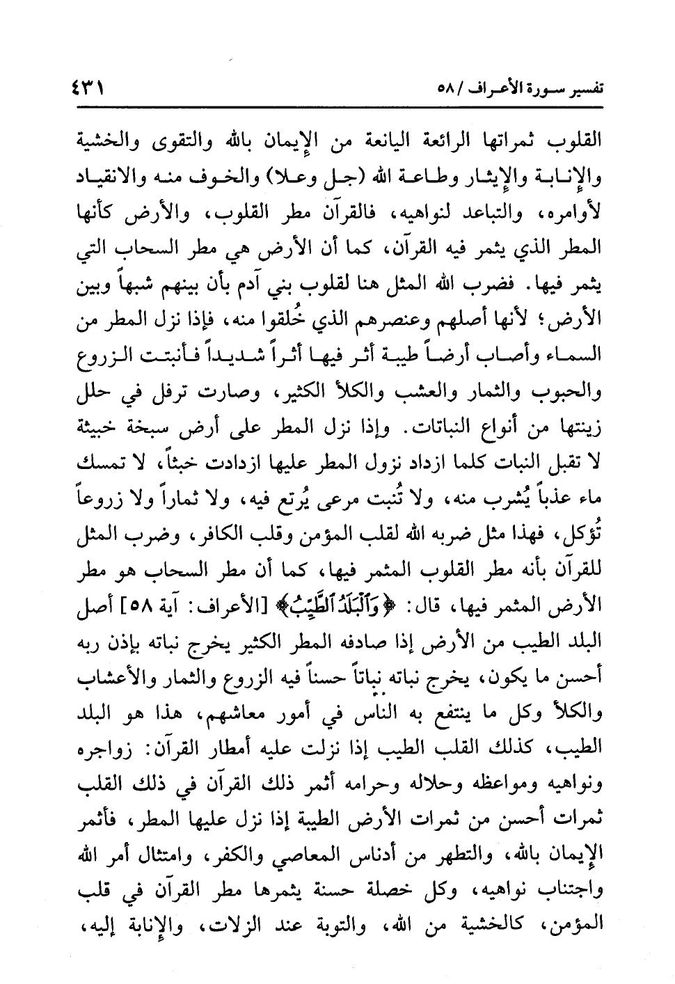 وإذا نزلَ المطرُ على أرضٍ سَبِخَةٍ خبيثةٍ لاَ تقبلُ النباتَ كلما ازدادَ نزولُ المطرِ عليها ازدادت خُبْثًا، لا تمسكُ ماءً عذبًا يُشْرَبُ منه، ولا تُنْبِتُ مرعًى يُرْتَعُ فيه، ولا ثمارًا ولا زروعًا تُؤْكَلُ، فهذا مَثَلٌ ضَرَبَهُ اللهُ لقلبِ المؤمنِ وقلبِ الكافرِ، وضربَ المثلَ للقرآنِ بأنه مطرُ القلوبِ المثمرِ فيها، كما أن مطرَ السحابِ هو مطرُ الأرضِ المثمرُ فيها، قال: {وَالْبَلَدُ الطَّيِّبُ} [الأعراف: آية 58] أصلُ البلدِ الطيبِ من الأرضِ إذا صادفَه المطرُ الكثيرُ يخرجُ نباتُه بإذنِ رَبِّهِ أَحْسَنَ ما يكونُ، يخرجُ نباتُه نباتًا حسنًا فيه الزروعُ والثمارُ والأعشابُ والكلأُ وكلُّ ما ينتفع به الناسُ في أمورِ معاشِهم، هذا هو البلدُ الطيبُ، كذلك القلبُ الطيبُ إذا نَزَلَتْ عليه أمطارُ القرآنِ: زواجرُه ونواهيه ومواعظُه وحلالُه وحرامُه أثمرَ ذلك القرآنُ في ذلك القلبِ ثمراتٍ أحسنَ من ثمراتِ الأرضِ الطيبةِ إذا نزلَ عليها المطرُ، فأثمرَ الإيمانَ باللهِ، والتطهرَ من أدناسِ المعاصِي والكفرِ، وامتثالَ أَمْرِ اللهِ واجتنابَ نواهيه.
