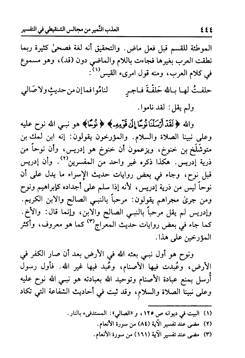 واللهِ {لَقَدْ أَرْسَلْنَا نُوحًا إِلَى قَوْمِهِ} {نُوحًا} هو نبيُّ اللهِ نوحٌ عليه وعلى نبينا الصلاةُ والسلامُ. والمؤرخونَ يقولونَ: إنه ابن لمك بن متوشَلَخ بن خنوخ، ويزعمونَ أن خنوخَ هو إدريسُ، وأن نوحًا من ذريةِ إدريسَ. هكذا ذَكَرَهُ غيرُ واحدٍ من المفسرين (¬2). وأن إدريسَ قَبْلَ نوحٍ، وجاء في بعضِ رواياتِ حديثِ الإسراءِ ما يدلُّ على أن نوحًا ليس من ذريةِ إدريسَ، لأنه إذا سَلَّمَ على أجدادِه كإبراهيمَ ونوحٍ وَمَنْ جرى مجرَاهم يقولونَ: مَرْحبًا بالنبيِّ الصالحِ والابنِ الكريمِ. وإدريسُ لم يَقُلْ مرحبًا بالنبيِّ الصالحِ والابنِ، وإنما قال: والأخِ. كما جاءَ في بعضِ رواياتِ حديثِ المعراجِ (¬3) كما هو معروفٌ، وأكثرُ المؤرخين على هذا.