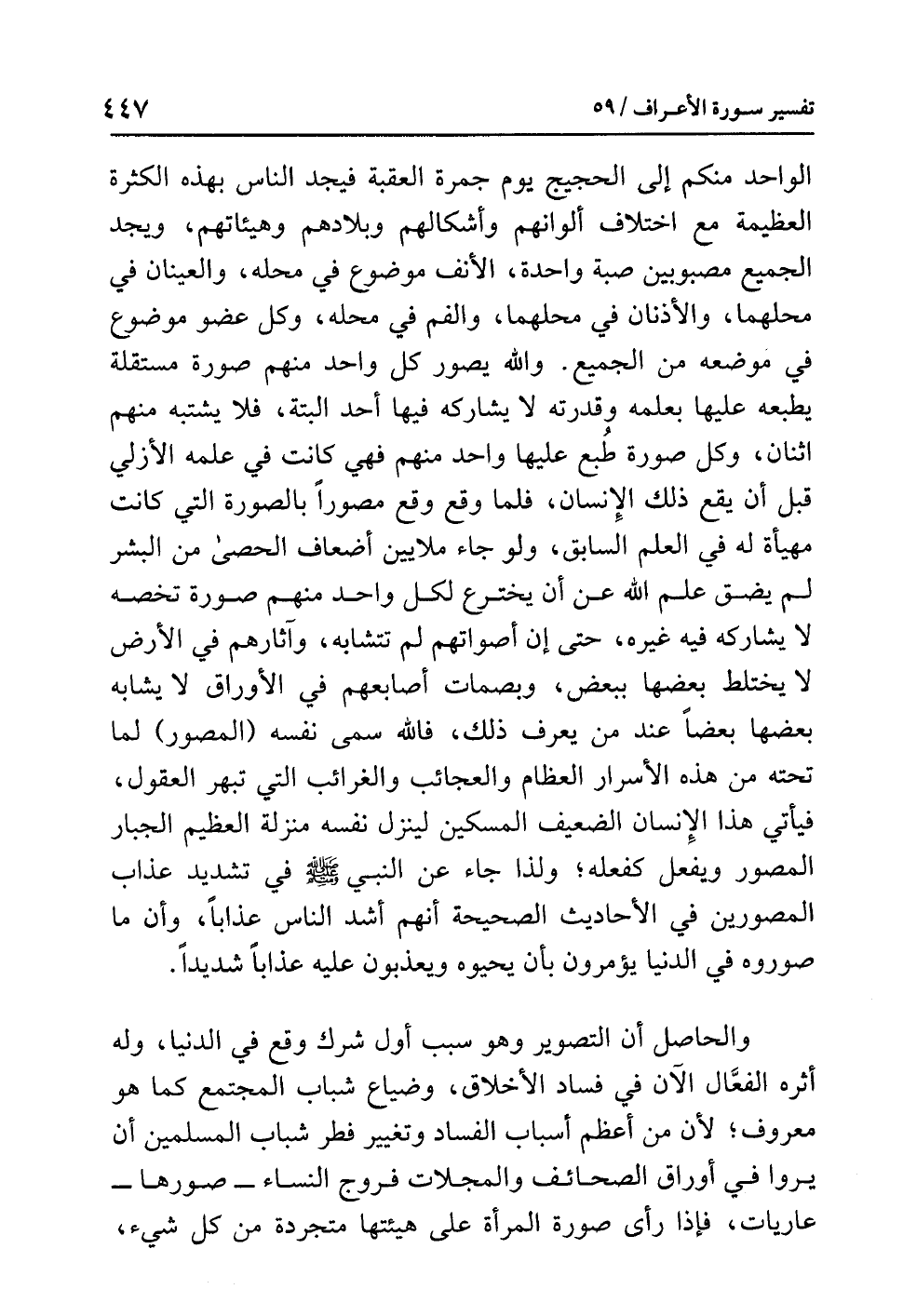 واللهُ يصورُ كلَّ واحدٍ منهم صورةً مستقلةً يطبعه عليها بعلمِه وقدرتِه لا يشاركُه فيها أحدٌ ألبتةَ، فلا يَشْتَبِهُ منهم اثنانِ، وكلُّ صورةٍ طُبِعَ عليها واحدٌ منهم فهي كانت في عِلْمِهِ الأزليِّ قبلَ أن يقعَ ذلك الإنسانُ، فلما وقعَ وقعَ مُصَوَّرًا بالصورةِ التي كانت مهيأةً له في العلمِ السابقِ، ولو جاءَ ملايينُ أضعافَ الحصى من البشرِ لم يَضِقْ علمُ اللَّهِ عن أن يخترعَ لكلِّ واحدٍ منهم صورةً تَخُصُّهُ لاَ يشاركُه فيه غيرُه، حتى إن أصواتَهم لم تتشابه، وآثارَهم في الأرضِ لا يختلطُ بعضُها ببعضٍ، وبصماتُ أصابعِهم في الأوراقِ لاَ يُشَابِهُ بعضُها بعضًا عندَ مَنْ يعرفُ ذلك، فاللهُ سَمَّى نفسَه (المصورَ) لِمَا تحتَه من هذه الأسرارِ العظامِ والعجائبِ والغرائبِ التي تُبْهِرُ العقولَ، فيأتي هذا الإنسانُ الضعيفُ المسكينُ لِيُنْزِلَ نفسَه منزلةَ العظيمِ الجبارِ المصورِ ويفعلُ كفعلِه؛ ولذا جاء عن النبيِّ صلى الله عليه وسلم فِي تشديدِ عذابِ الْمُصَوِّرِينَ في الأحاديثِ الصحيحةِ أنهم أشدُّ الناسِ عذابًا، وأن ما صَوَّرُوهُ في الدنيا يُؤْمَرُونَ بأن يُحْيُوهُ وَيُعَذَّبُونَ عليه عذابًا شديدًا.