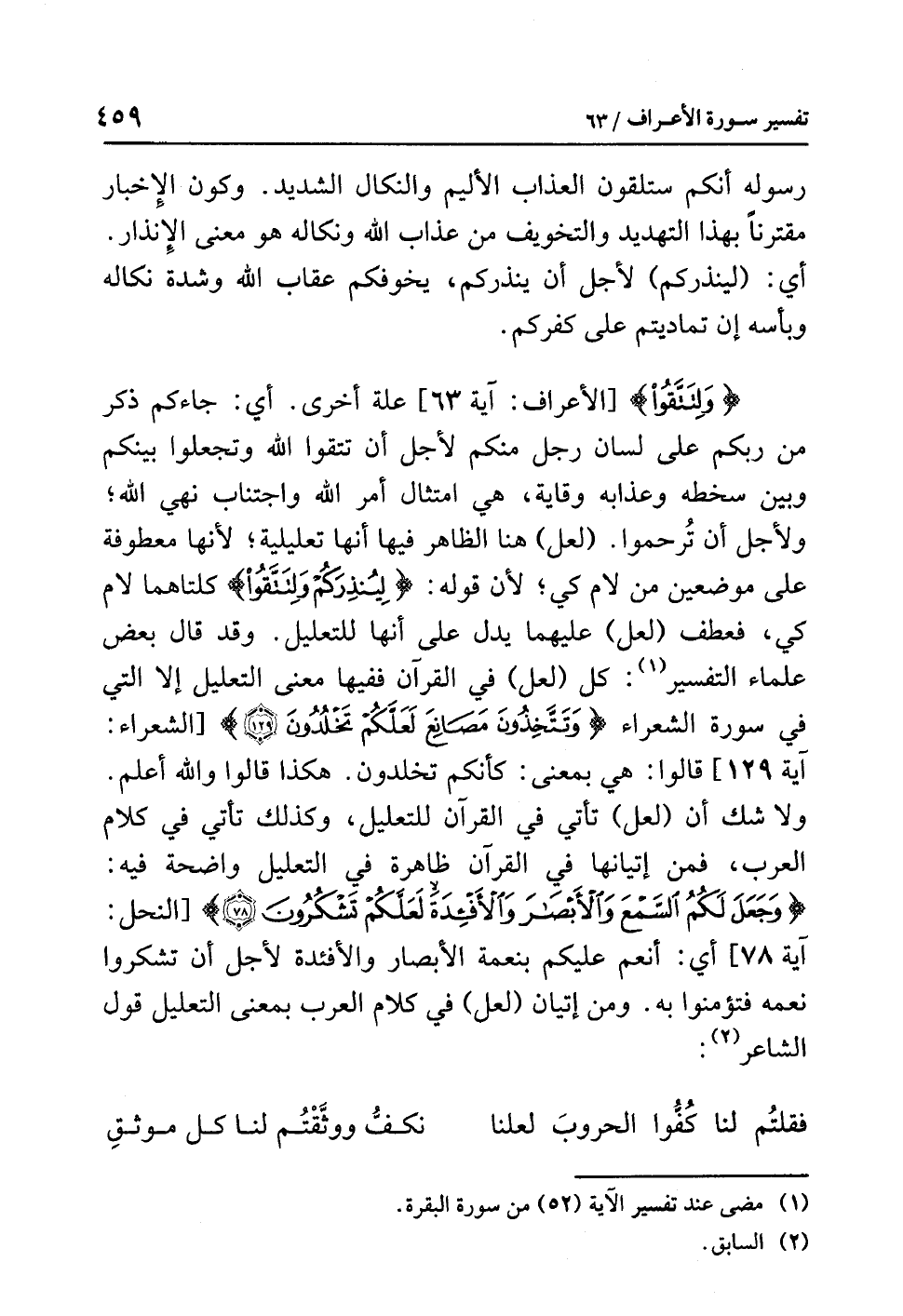 ولا شكَّ أن (لعلَّ) تأتِي في القرآنِ للتعليلِ، وكذلك تأتِي في كلامِ العربِ، فَمِنْ إتيانِها في القرآنِ ظاهرةً في التعليلِ واضحةً فيه: {وَجَعَلَ لَكُمُ الْسَّمْعَ وَالأَبْصَارَ وَالأَفْئِدَةَ لَعَلَّكُمْ تَشْكُرُونَ} [النحل: آية78] أي: أَنْعَمَ عليكم بنعمةِ الأبصارِ والأفئدةِ لأَجْلِ أن تشكروا نعمَه فتؤمنوا به. وَمِنْ إتيانِ (لعل) في كلامِ العربِ بمعنَى التعليلِ قولُ الشاعرِ (¬2):