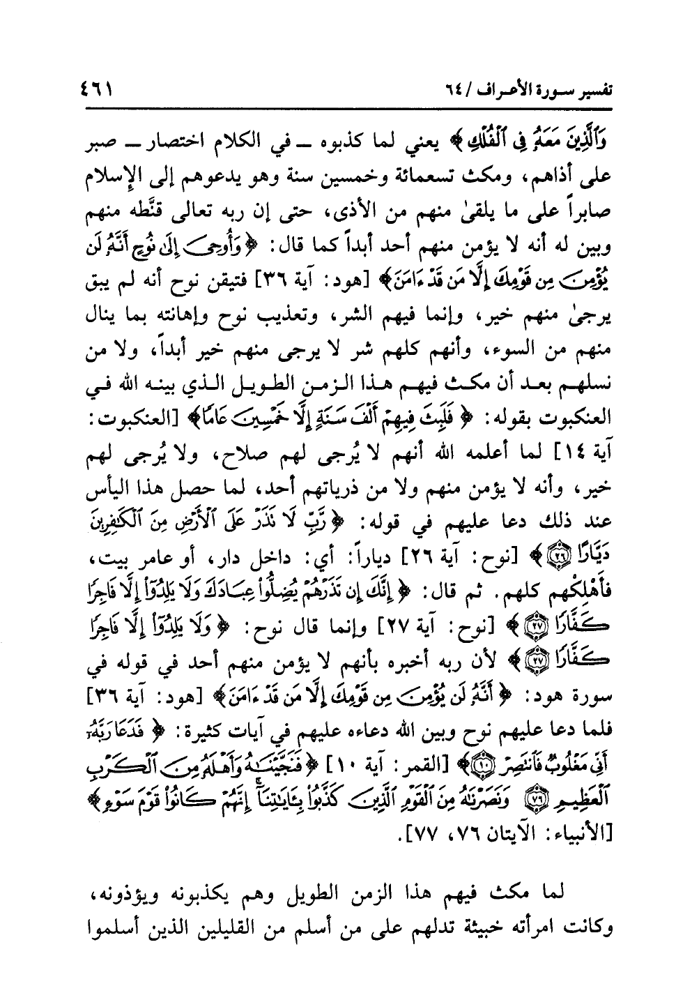 ثم قال: {إِنَّكَ إِنْ تَذَرْهُمْ يُضِلُّوا عِبَادَكَ وَلاَ يَلِدُوا إِلاَّ فَاجِرًا كَفَّارًا (27)} [نوح: آية 27] وإنما قال نوحٌ: {وَلاَ يَلِدُوا إِلاَّ فَاجِرًا كَفَّارًا} لأن رَبَّهُ أخبرَه بأنهم لا يؤمنُ منهم أحدٌ في قولِه في سورةِ هودٍ: {أَنَّهُ لَنْ يُؤْمِنَ مِنْ قَوْمِكَ إِلاَّ مَنْ قَدْ آمَنَ} [هود: آية 36] فَلَمَّا دعا عليهم نوحٌ وَبَيَّنَ اللهُ دعاءَه عليهم فيٍ آياتٍ كثيرةٍ: {فَدَعَا رَبَّهُ أَنِّي مَغْلُوبٌ فَانْتَصِرْ (10)} [القمر: آية 10] {فَنَجَّيْنَاهُ وَأَهْلَهُ مِنَ الْكَرْبِ الْعَظِيمِ (76) وَنَصَرْنَاهُ مِنَ الْقَوْمِ الَّذِينَ كَذَّبُوا بِآيَاتِنَا إِنَّهُمْ كَانُوا قَوْمَ سَوْءٍ} [الأنبياء: الآيتان 76، 77].