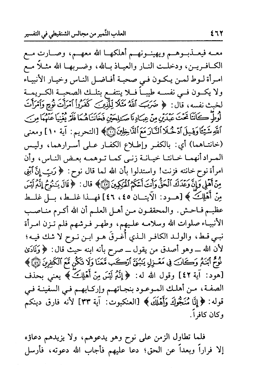 معه فيعذبونَهم ويهينونَهم أهلكها اللهُ معهم، وصارت مع الكافرين، ودخلتِ النارَ والعياذُ بالله، وَضَرَبَهَا اللهُ مثلاً مع امرأةِ لوطٍ لِمَنْ يكونُ في صحبةِ أفاضلِ الناسِ وخيارِ الأنبياءِ ولا يكونُ في نفسِه طَيِّبًا فلا ينتفعُ بتلك الصحبةِ الكريمةِ لِخُبْثِ نفسِه، قال: {ضَرَبَ اللَّهُ مَثَلاً لِّلَّذِينَ كَفَرُوا امْرَأَةَ نُوحٍ وَامْرَأَةَ لُوطٍ كَانَتَا تَحْتَ عَبْدَيْنِ مِنْ عِبَادِنَا صَالِحَيْنِ فَخَانَتَاهُمَا فَلَمْ يُغْنِيَا عَنْهُمَا مِنَ اللَّهِ شَيْئًا وَقِيلَ ادْخُلاَ النَّارَ مَعَ الدَّاخِلِينَ (10)} [التحريم: آية 10] ومعنَى (خانتاهما) أي: بالكفرِ وإطلاعِ الكفارِ على أسرارِهما، وليس المرادُ أنهما خَانَتَا خيانةَ زِنًى كما تَوَهَّمَهُ بعضُ الناسِ، وأن امرأةَ نوحٍ خَانَتْهُ فَزَنَتْ! واستدلوا بأن اللهَ لَمَّا قال نوحٌ: {رَبِّ إِنَّ ابْنِي مِنْ أَهْلِي وَإِنَّ وَعْدَكَ الْحَقُّ وَأَنْتَ أَحْكَمُ الْحَاكِمِينَ} قال: {قَالَ يَا نُوحُ إِنَّهُ لَيْسَ مِنْ أَهْلِكَ} [هود: الآيتانِ 45، 46] فهذا غلطٌ، بل غلطٌ عظيمٌ فاحشٌ. والمحققونَ من أهلِ العلمِ أن اللهَ كرم مناصبَ الأنبياءِ صلواتُ اللهِ وسلامُه عليهم، وَطَهَّرَ فُرُشَهُمْ فلم تَزْنِ امرأةُ نَبِيٍّ قَطُّ، والولدُ الكافرُ الذي أُغْرِقَ هو ابنُ نوحٍ لا شكَّ فيه؛ لأن اللهَ - وهو أصدقُ مَنْ يقولُ - صَرَّحَ بأنه ابنُه حيث قال: {وَنَادَى نُوحٌ ابْنَهُ وَكَانَ فِي مَعْزِلٍ يَا بُنَيَّ ارْكَب مَّعَنَا وَلاَ تَكُن مَّعَ الْكَافِرِينَ} [هود: آية 42] وقولُ اللهِ له: {مِنْ أَهْلِكَ} يعنِي بحذفِ الصفةِ، من أهلِك الموعودِ بنجاتِهم وإركابِهم في السفينةِ في قولِه: {إِنَّا مُنَجُّوكَ وَأَهْلَكَ} [العنكبوت: آية 33] لأنه فَارَقَ دينَكم وَكَانَ كافرًا.
