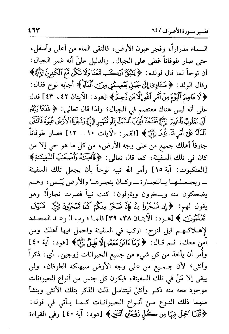 السماءَ مِدْرَارًا، وَفَجَّرَ عيونَ الأرضِ، فَالْتَقَى الماءُ من أعلى وأسفلَ، حتى صارَ طُوفَانًا غَطَّى على الجبالِ. والدليلُ على أنه غَمَرَ الجبالَ: أن نوحًا لَمَّا قال لولدِه: {يَا بُنَيَّ ارْكَب مَّعَنَا وَلاَ تَكُن مَّعَ الْكَافِرِينَ} وقال الولدُ: {سَآوِي إِلَى جَبَلٍ يَعْصِمُنِي مِنَ الْمَاءِ} أجابَه نوحٌ فقال: {لاَ عَاصِمَ الْيَوْمَ مِنْ أَمْرِ اللَّهِ إِلاَّ مَن رَّحِمَ} [هود: الآيتان 42، 43] فَدَلَّ على أنه ليسَ هناك معتصمٌ في الجبالِ؛ وَلِذَا قال تعالى: {فَدَعَا رَبَّهُ أَنِّي مَغْلُوبٌ فَانْتَصِرْ (10) فَفَتَحْنَا أَبْوَابَ السَّمَاءِ بِمَاءٍ مُّنْهَمِرٍ (11) وَفَجَّرْنَا الْأَرْضَ عُيُونًا فَالْتَقَى الْمَاءُ عَلَى أَمْرٍ قَدْ قُدِرَ (12)} [القمر: الآيات 10 - 12] فصارَ طوفانًا جارفًا أَهْلَكَ جميعَ مَنْ على وجهِ الأرضِ، مِنْ كُلِّ ما هو حَيٌّ إلا مَنْ كان في تلك السفينةِ، كما قال تعالى: {فَأَنْجَيْنَاهُ وَأَصْحَابَ السَّفِينَةِ} [العنكبوت: آية 15] وأمر اللهُ نَبِيَّهُ نوحًا بأن يجعلَ تلك السفينةَ - ويجعلَها بالنجارةِ - وكان ينجرها والأرضُ يبَس، وهم يضحكونَ منه ويسخرونَ ويقولونَ: كنتَ نَبِيًّا فصرتَ نَجَّارًا! وهو يقولُ لهم: {إِنْ تَسْخَرُوا مِنَّا فَإِنَّا نَسْخَرُ مِنْكُمْ كَمَا تَسْخَرُونَ (38) فَسَوْفَ تَعْلَمُونَ} [هود: الآيتان 38، 39] فَلَمَّا قَرُبَ الوعدُ المحددُ لإهلاكِهم قيلَ لنوحٍ: ارْكَبْ في السفينةِ وَاحْمِلْ فيها أهلكَ ومن آمَنَ مَعَكَ، ثم قال: {وَمَا آمَنَ مَعَهُ إِلاَّ قَلِيلٌ} [هود: آية 40] وَأَمَرَ أن يأخذَ من كُلِّ شيءٍ من جميعِ الحيواناتِ زَوْجَيْنِ.