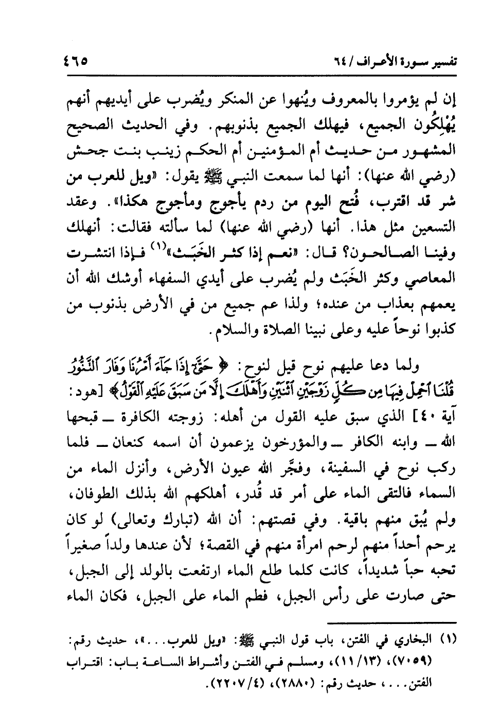 وفي الحديثِ الصحيحِ المشهورِ من حديثِ أُمِّ المؤمنينَ أُمِّ الحكمِ زينبَ بنتِ جحشٍ (رضي الله عنها): أنها لَمَّا سَمِعَتِ النبيَّ صلى الله عليه وسلم يقولُ: «وَيْلٌ لِلْعَرَبِ مِنْ شَرٍّ قَدِ اقْتَرَبَ، فُتِحَ الْيَوْمَ مِنْ رَدْمِ يَأْجُوجَ وَمَأْجُوجَ هَكَذَا». وعقدَ التسعينَ مثل هذا. أنها (رضي الله عنها) لَمَّا سَأَلَتْهُ فقالت: أَنَهْلِكُ وفينا الصالحونَ؟ قال: «نَعَمْ إِذَا كَثُرَ الْخَبَثُ» (¬1) فإذا انتشرت المعاصي وكثر الخَبَثُ ولم يُضرب على أيدي السفهاءِ أوشكَ اللهُ أن يعمهم بعذابٍ من عندِه؛ ولذا عَمَّ جميعَ مَنْ في الأرضِ بذنوبِ مَنْ كَذَّبُوا نوحًا عليه وعلى نبيِّنا الصلاةُ والسلامُ.