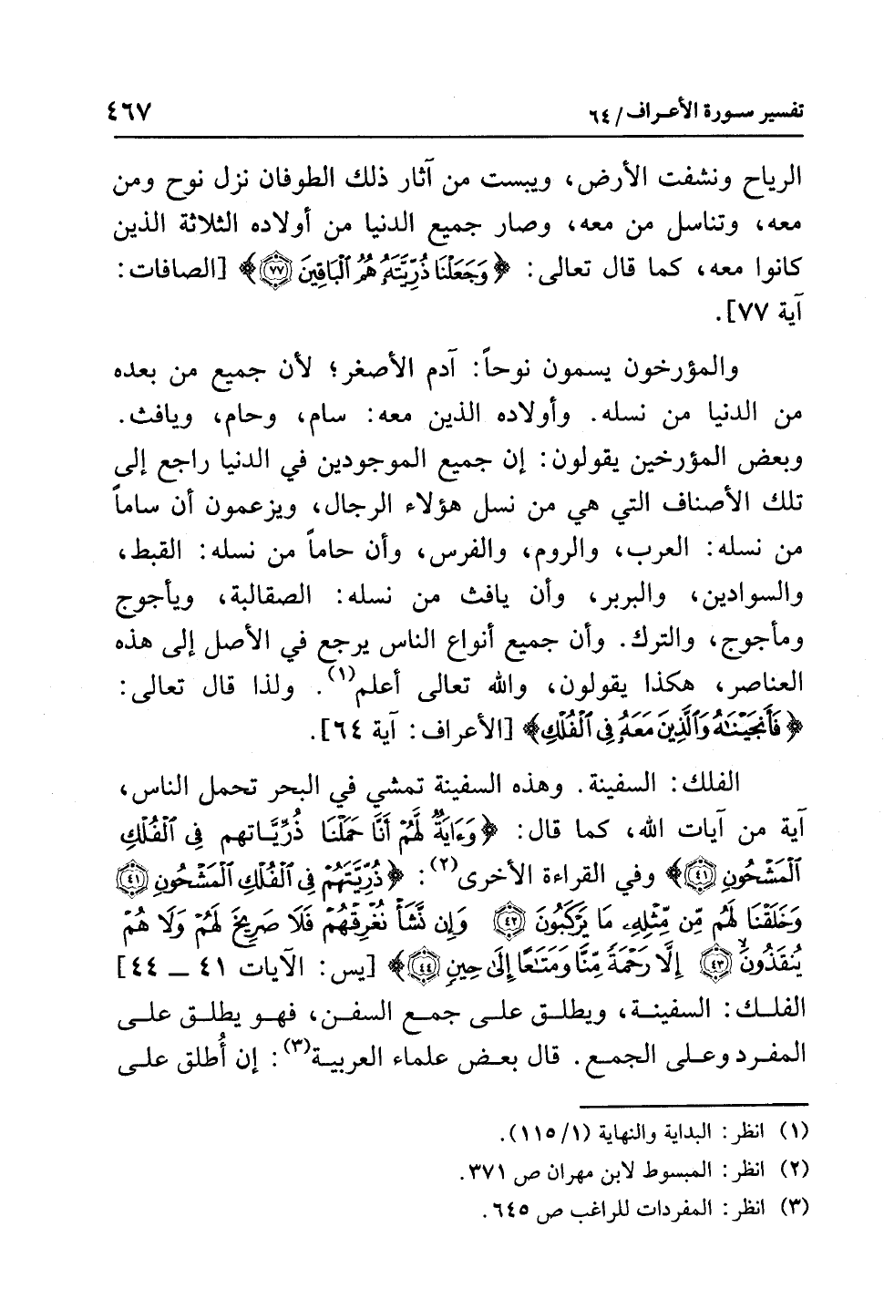 والمؤرخونَ يُسَمُّونَ نوحًا: آدمَ الأصغرَ؛ لأن جميعَ مَنْ بَعْدَهُ من الدنيا من نَسْلِهِ. وأولادُه الذين مَعَهُ: سام وحام ويافث. وبعضُ المؤرخين يقولونَ: إن جميعَ الموجودين في الدنيا راجعٌ إلى تلك الأصنافِ التي هِيَ مِنْ نسلِ هؤلاء الرجالِ، ويزعمونَ أن سَامًا من نسلِه: العربُ والرومُ والفرسُ، وأن حامًا من نسلِه: القبطُ والسوادين والبربرُ، وأن يافث من نسلِه: الصقالبةُ ويأجوجُ ومأجوجُ والتركُ. وأن جميعَ أنواعِ الناسِ يرجعُ في الأصلِ إلى هذه العناصرِ، هكذا يقولونَ، وَاللَّهُ تعالى أَعْلَمُ (¬1). وَلِذَا قال تعالى: {فَأَنْجَيْنَاهُ وَالَّذِينَ مَعَهُ فِي الْفُلْكِ} [الأعراف: آية 64].