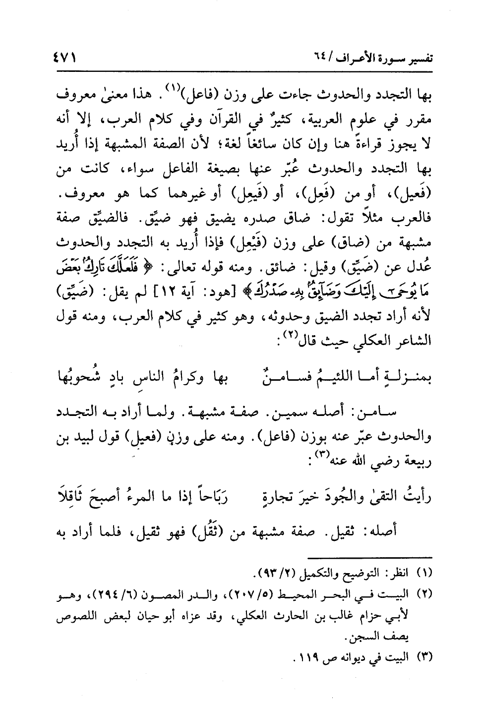 بها التجددُ والحدوثُ جاءت على وزنِ (فاعل) (¬1). هذا معنًى معروفٌ مُقَرَّرٌ في علومِ العربيةِ، كثيرٌ في القرآنِ وفي كلامِ العربِ، إلا أنه لا يجوزُ قراءةً هنا وإن كان سائغًا لغةً؛ لأن الصفةَ المشبهةَ إذا أُرِيدَ بها التجددُ والحدوثُ عُبِّرَ عنها بصيغةِ الفاعلِ، سواء كانت من (فَعيل)، أو من (فَعِل)، أو (فَيعِل) أو غيرِهما كما هو معروفٌ. فالعربُ مثلاً تقولُ: ضَاقَ صدرُه يضيقُ فهو ضيِّق. فالضيِّقُ صفةٌ مشبهةٌ من (ضاق) على وزنِ (فَيْعِل) فإذا أُرِيدَ به التجددُ والحدوثُ عُدِلَ عن (ضَيْق) وقيل: ضائق. ومنه قولُه تعالى: {فَلَعَلَّكَ تَارِكٌ بَعْضَ مَا يُوحَى إِلَيْكَ وَضَائِقٌ بِهِ صَدْرُكَ} [هود: آية 12] لَمْ يَقُلْ: (ضَيِّق) لأنه أَرَادَ تجددَ الضيقِ وحدوثَه، وهو كثيرٌ في كلامِ العربِ، ومنه قولُ الشاعرِ العكلي حيث قال (¬2):