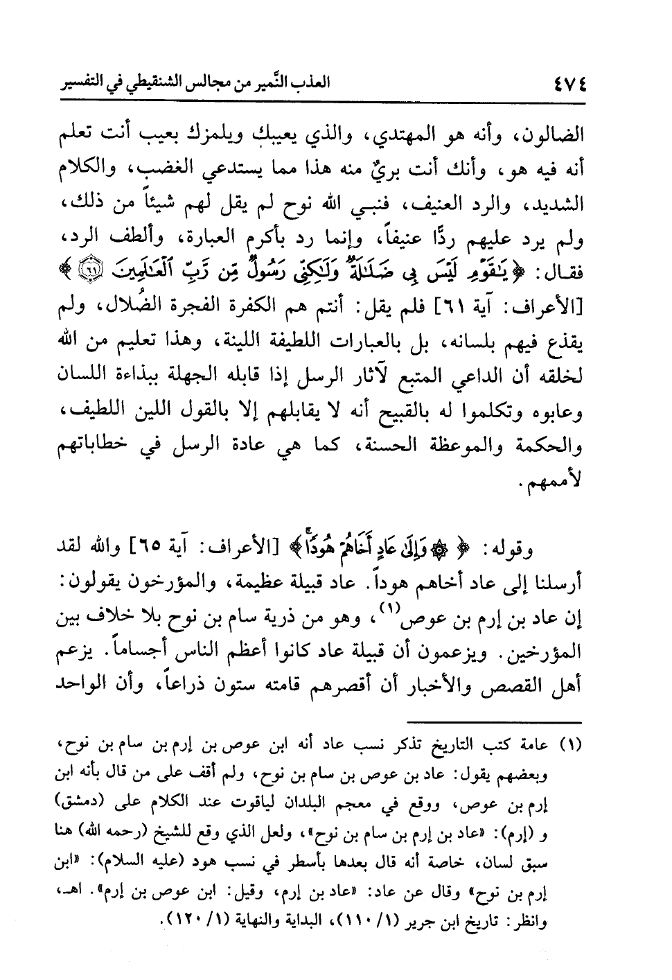 (¬1) عامة كتب التاريخ تذكر نسب عاد أنه ابن عوص بن إرم بن سام بن نوح. وبعضهم يقول: عاد بن عوص بن سام بن نوح. ولم أقف على من قال بأنه ابن إرم بن عوص. ووقع في معجم البلدان لياقوت عند الكلام على (دمشق) و (إرم): «عاد بن إرم بن سام بن نوح». ولعل الذي وقع للشيخ (رحمه الله) هنا سبق لسان، خاصة أنه قال بعدها بأسطر في نسب هود (عليه السلام): «ابن إرم بن نوح» وقال عن عاد: «عاد بن إرم. وقيل: ابن عوص بن إرم» ا. هـ. وانظر: تاريخ ابن جرير (1/ 110)، البداية والنهاية (1/ 120).