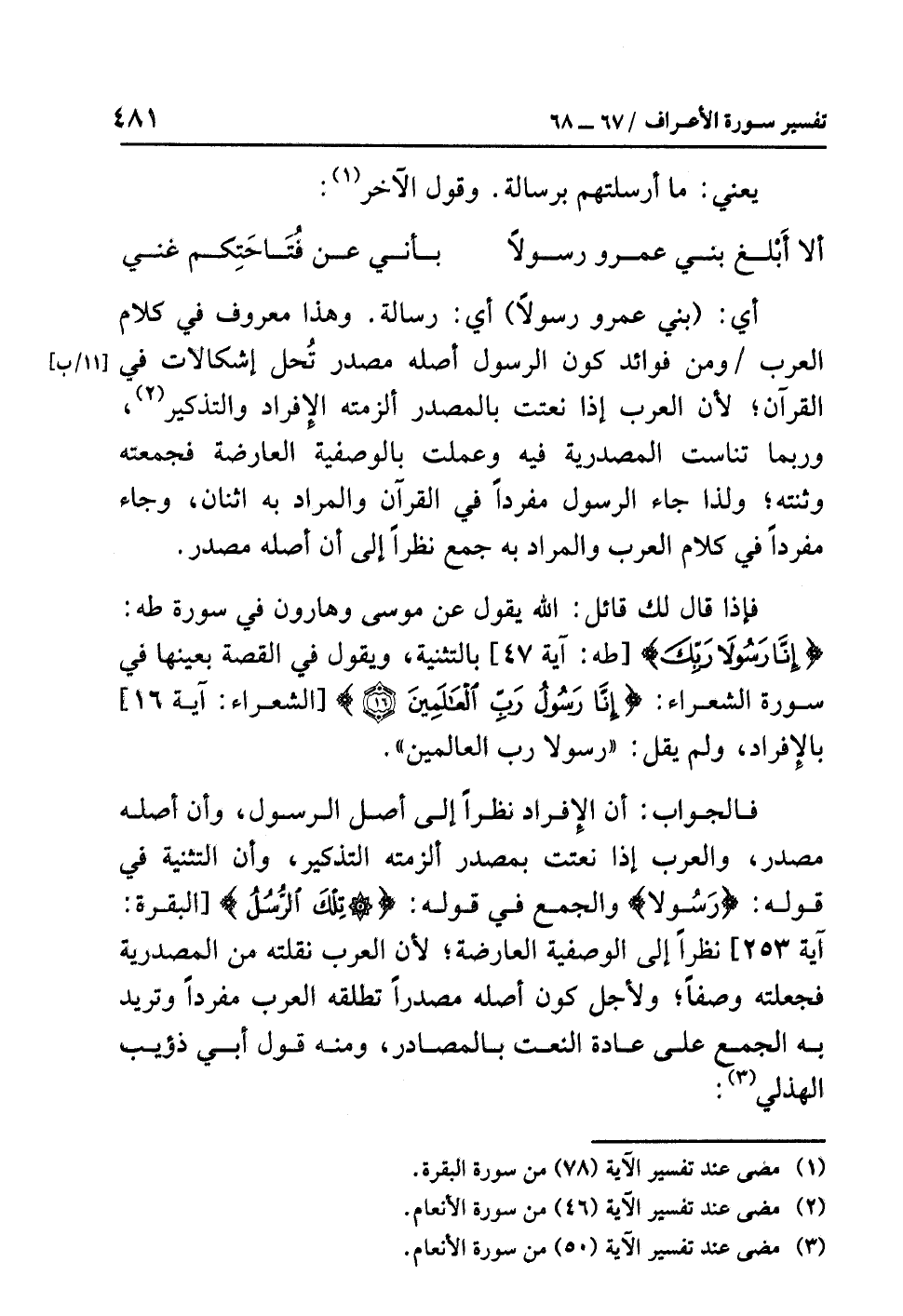 فالجوابُ: إن الإفرادَ نَظَرًا إلى أصلِ الرسولِ، وأن أصلَه مصدرٌ، والعربُ إذا نَعَتَتْ بمصدرٍ أَلْزَمَتْهُ التذكيرَ، وأن التثنيةَ في قولِه: {رَسُولاَ} والجمعُ في قولِه: {تِلْكَ الرُّسُلُ} [البقرة: آية 253] نظرًا إلى الوصفيةِ العارضةِ؛ لأن العربَ نَقَلَتْهُ من المصدريةِ فَجَعَلَتْهُ وصفًا؛ ولأجلِ كونِ أصلِه مصدرًا تُطْلِقُهُ العربُ مفردًا وتريدُ به الجمعَ على عادةِ النعتِ بالمصادرِ، ومنه قولُ أَبِي ذؤيبٍ الْهُذَلِيِّ (¬3):